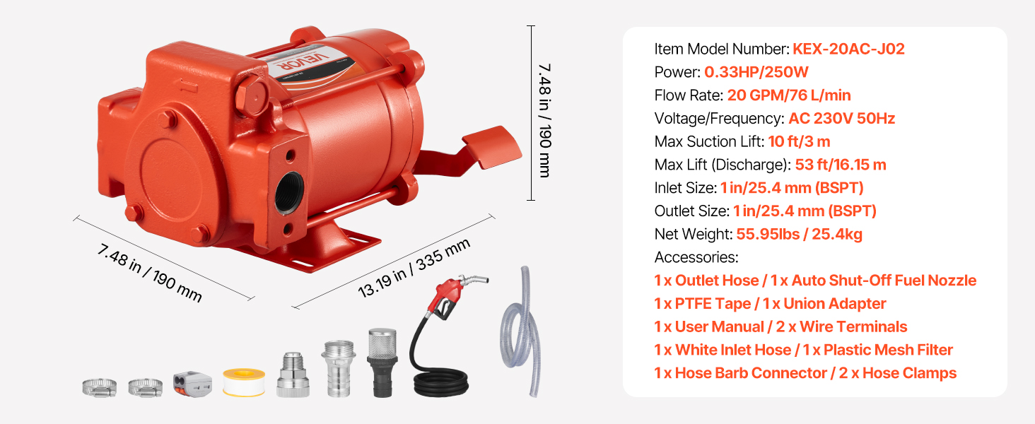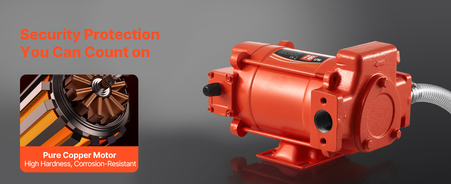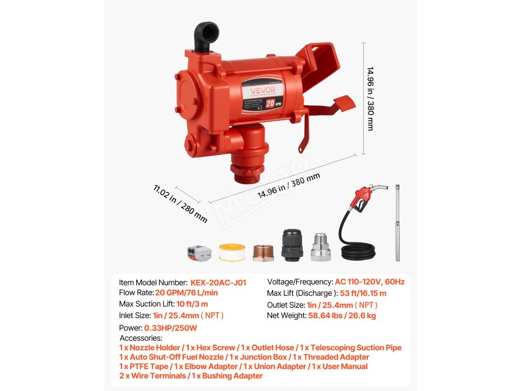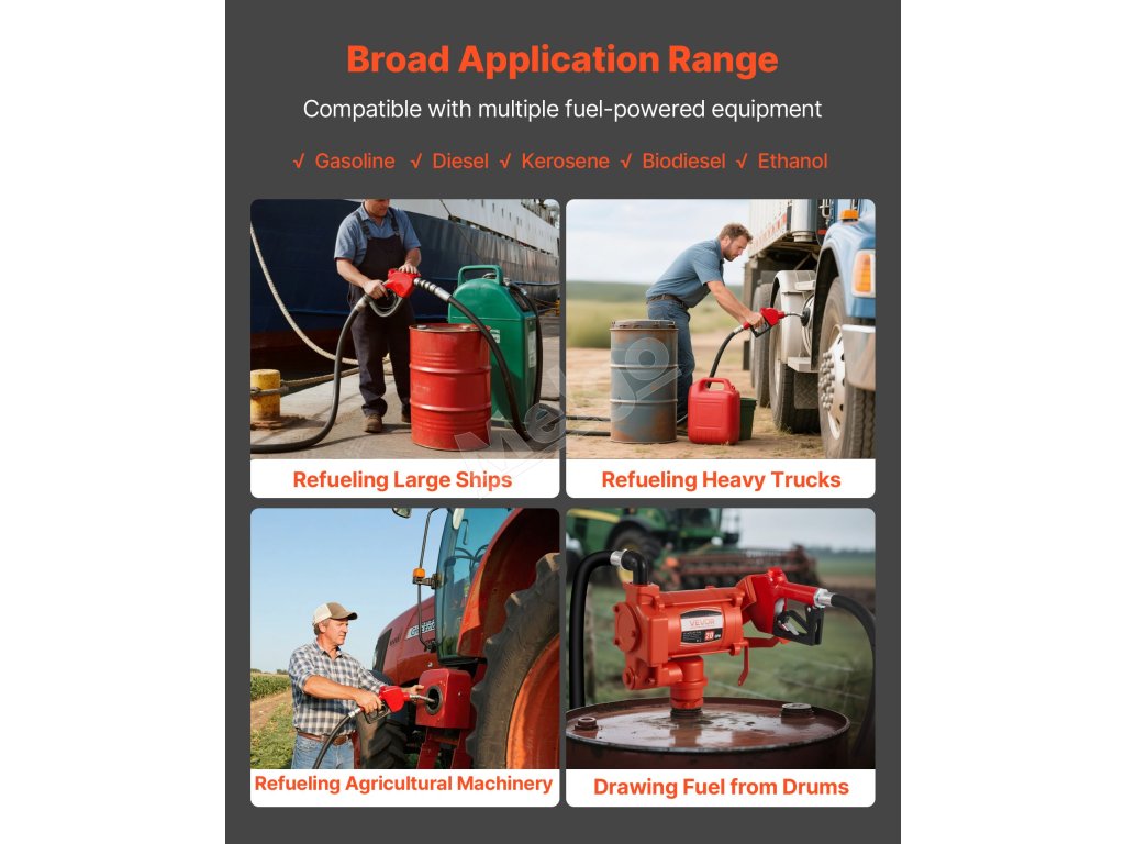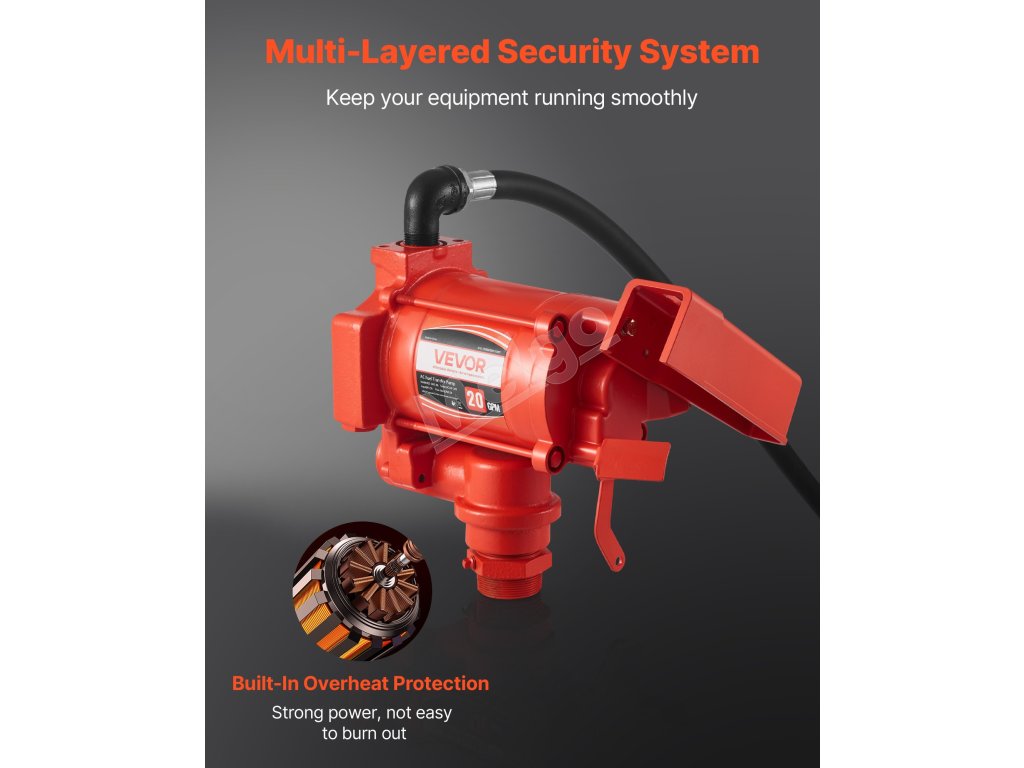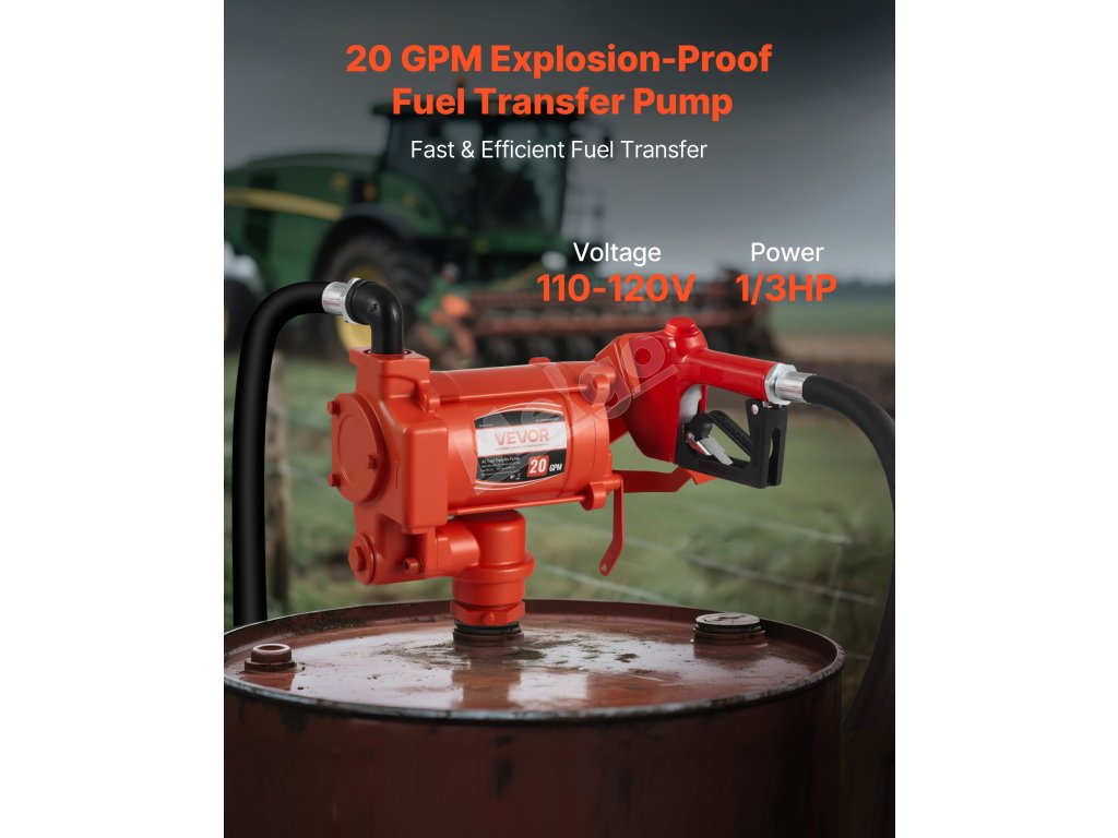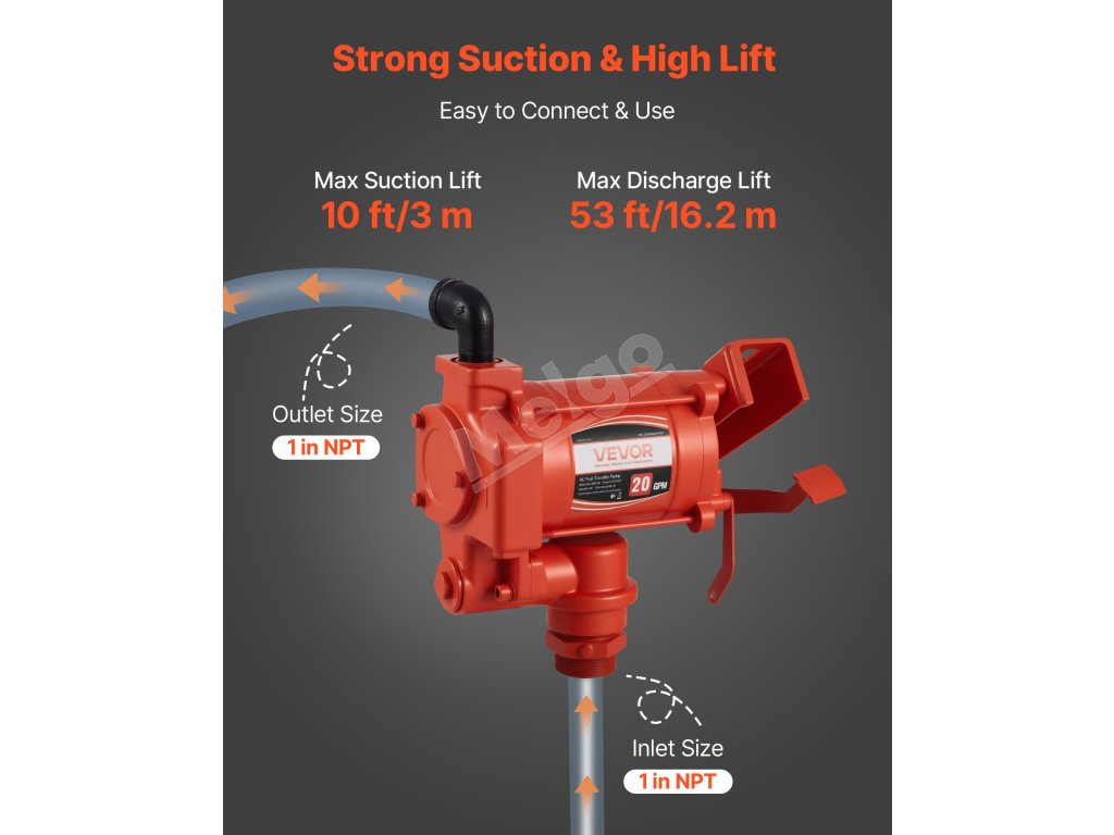 Rýchle prečerpávanie paliva s maximálnym prietokom 20 GPM (76 l/min), sacím zdvihom 10 ft (3 m) a maximálnym zdvihom 53 ft (16,15 m). Vďaka motoru z čistej medi, liatinovej hlave čerpadla a zabudovanej ochrane proti prehriatiu poskytuje toto čerpadlo spoľahlivý výkon a bezpečnú prevádzku pre naftu, petrolej a bionaftu.