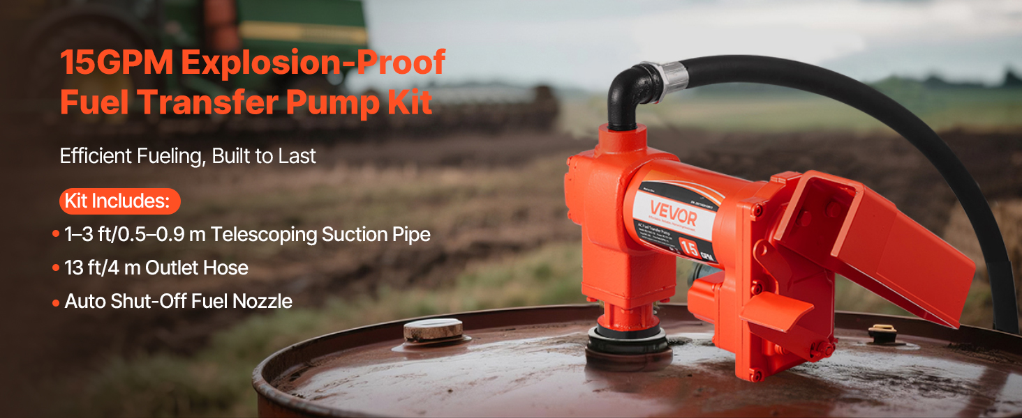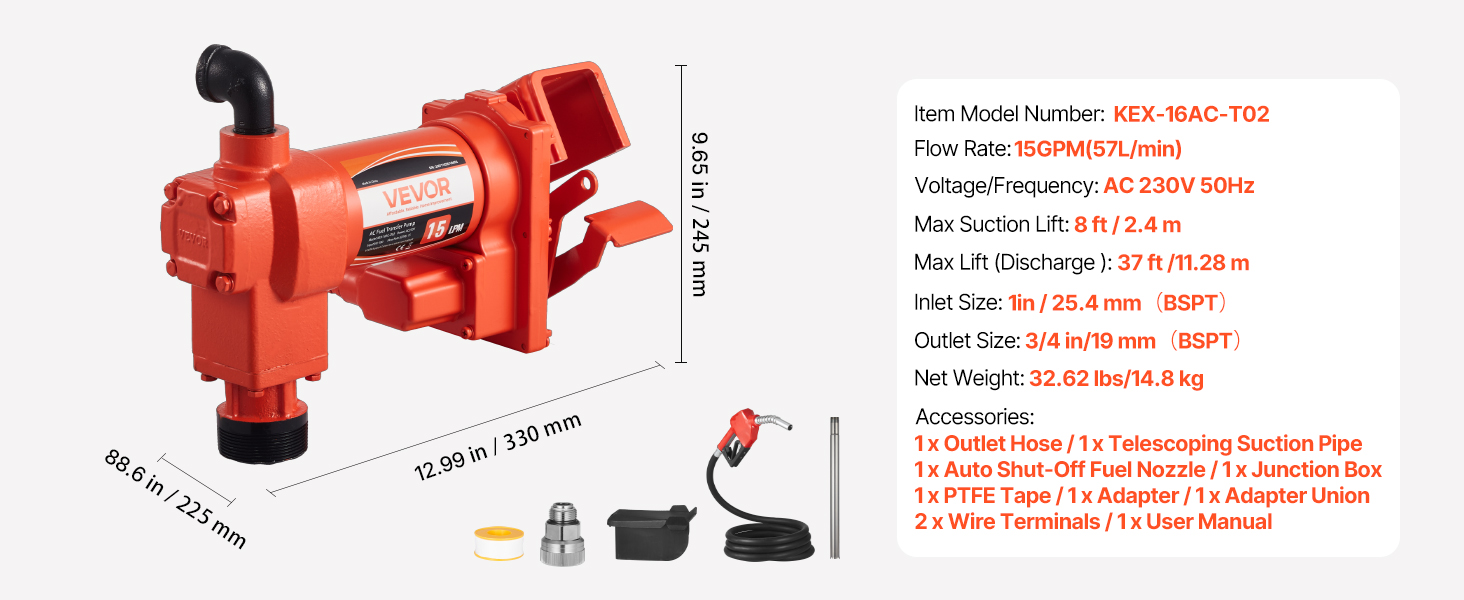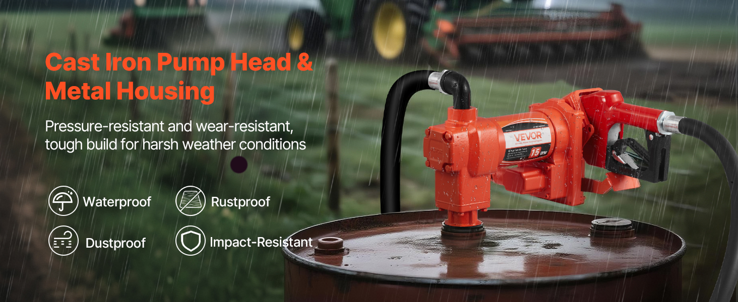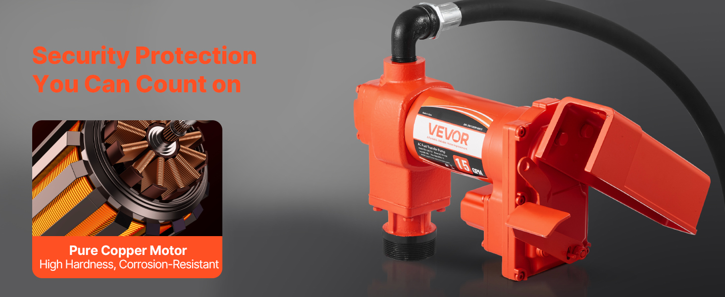 Rýchle prečerpávanie paliva s maximálnym prietokom 15 GPM (57 l/min), maximálnym nasávaním 8 ft (2,4 m) a maximálnym zdvihom 37 ft (11,28 m). Vďaka motoru z čistej medi, liatinovej hlave čerpadla a zabudovanej ochrane proti prehriatiu poskytuje toto čerpadlo spoľahlivý výkon a bezpečnú prevádzku pre naftu, petrolej a bionaftu.