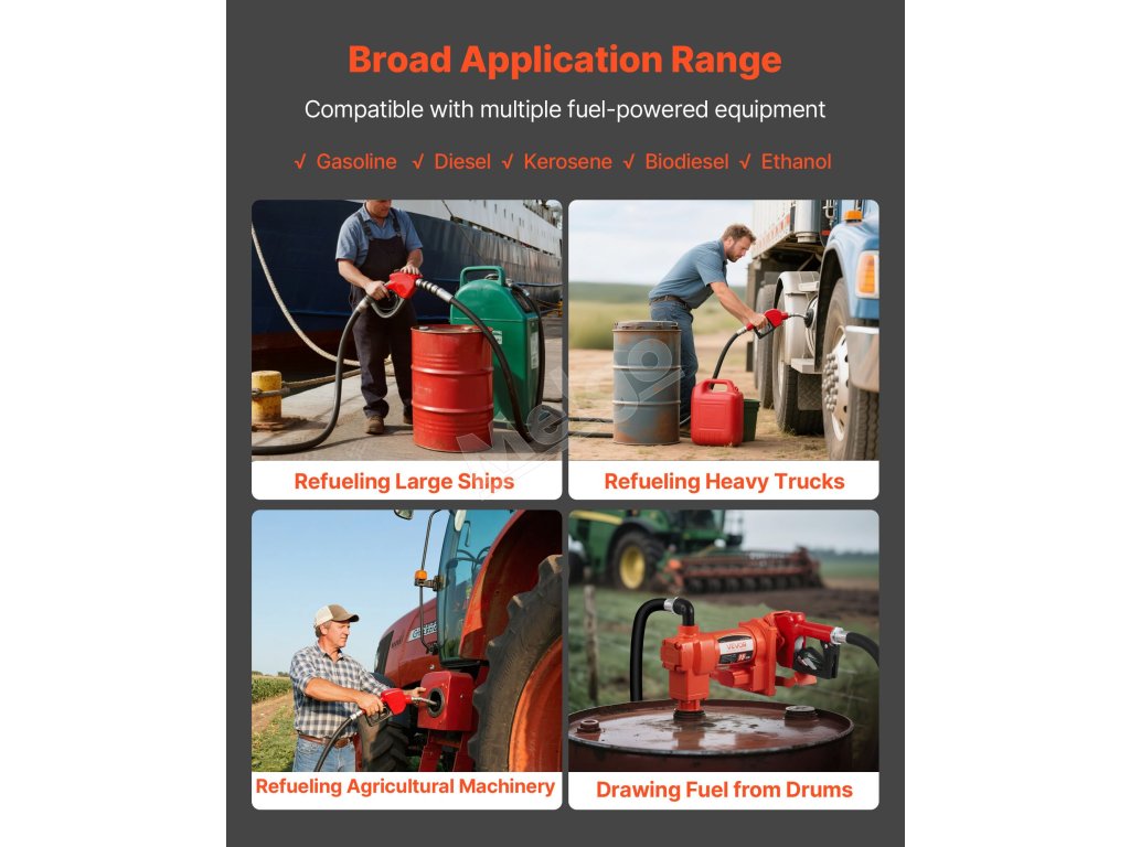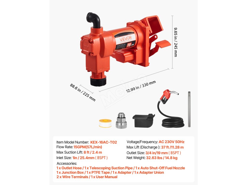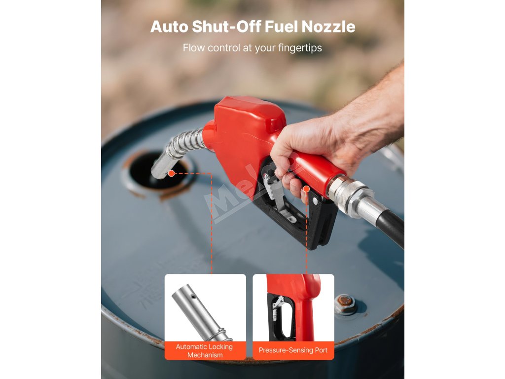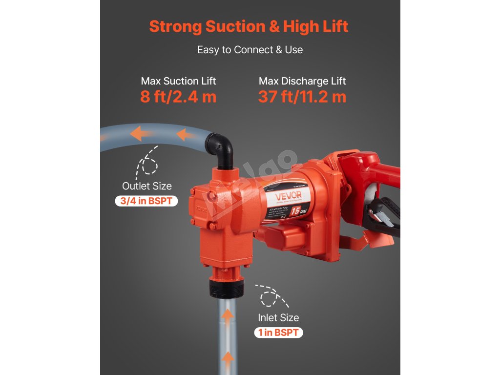 Rýchle prečerpávanie paliva s maximálnym prietokom 15 GPM (57 l/min), maximálnym nasávaním 8 ft (2,4 m) a maximálnym zdvihom 37 ft (11,28 m). Vďaka motoru z čistej medi, liatinovej hlave čerpadla a zabudovanej ochrane proti prehriatiu poskytuje toto čerpadlo spoľahlivý výkon a bezpečnú prevádzku pre naftu, petrolej a bionaftu.