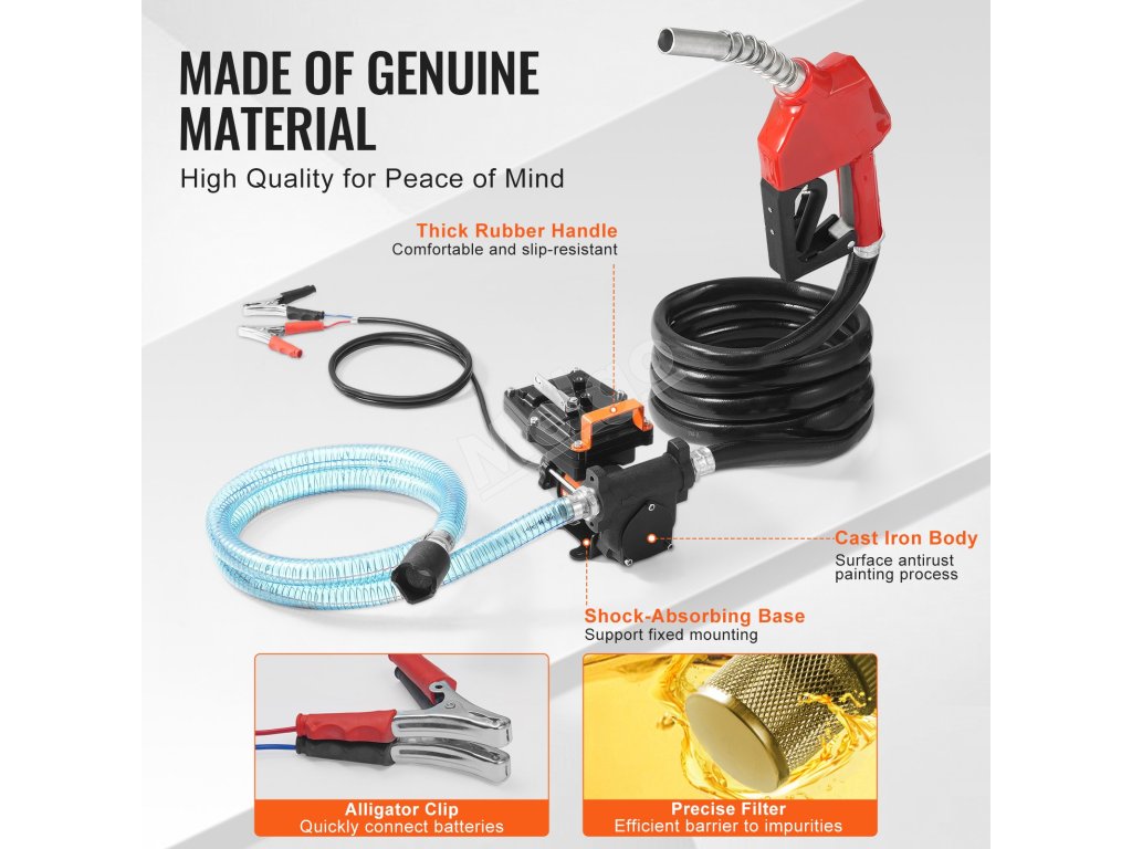 Čerpadlo na prečerpávanie paliva je vybavené 13 ft gumovou výstupnou hadicou, ktorá je známa svojou odolnosťou proti tankovaniu na dlhé vzdialenosti, zamotávaniu a vysokým prietokom. Obsahuje aj 6,6ft priehľadnú vstupnú hadicu s kovovým sieťovým filtrom, ktorý zabraňuje prenikaniu nečistôt počas tankovania. Má sa postarať o to, aby bolo vaše čerpadlo v špičkovej kondícii.