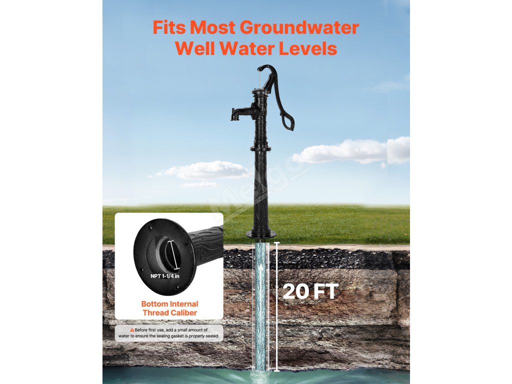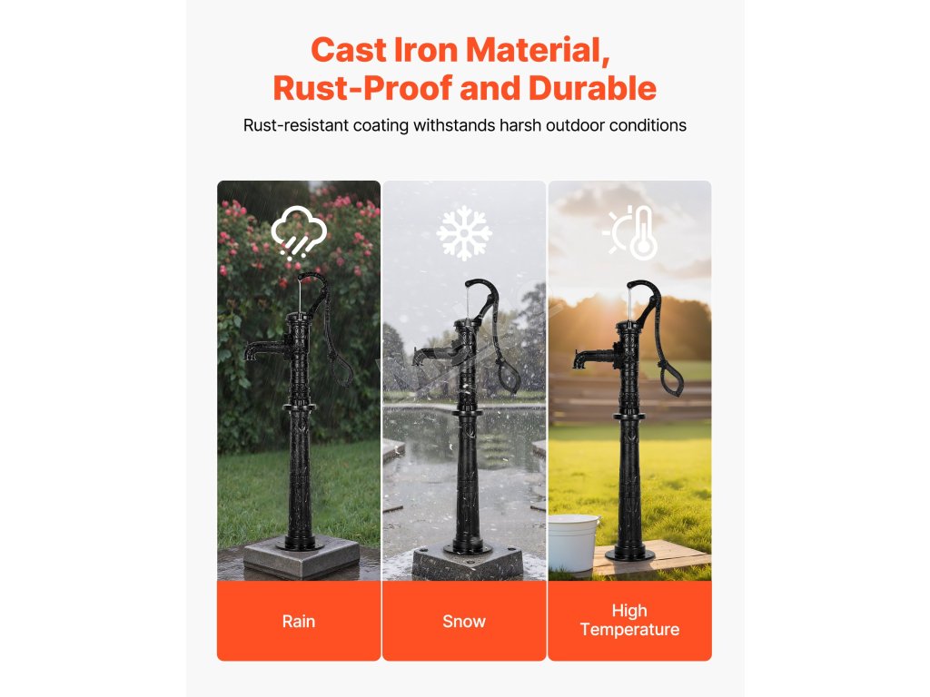 Toto ručné vodné čerpadlo z liatiny, vyrobené z prvotriednych materiálov, poskytuje stabilný a odolný výkon. Je odolná voči ohýbaniu a lámaniu pri častom používaní. Spoľahlivé tesnenie znižuje vnikanie vzduchu, čím sa zvyšuje účinnosť a rýchlosť vodného čerpadla.