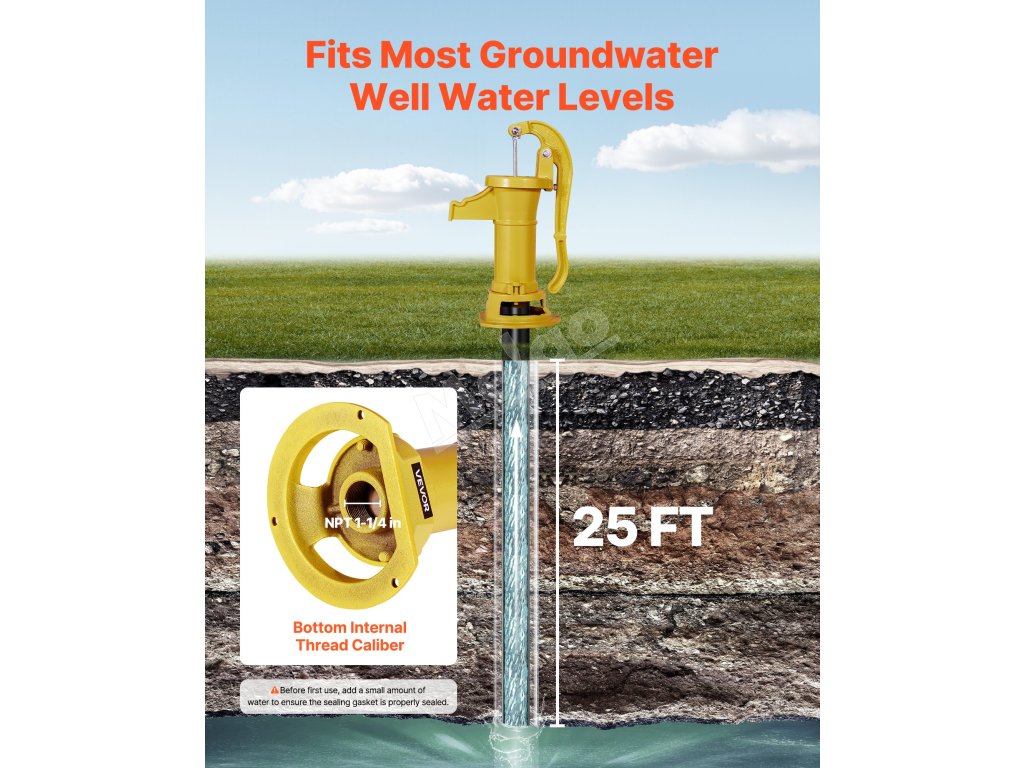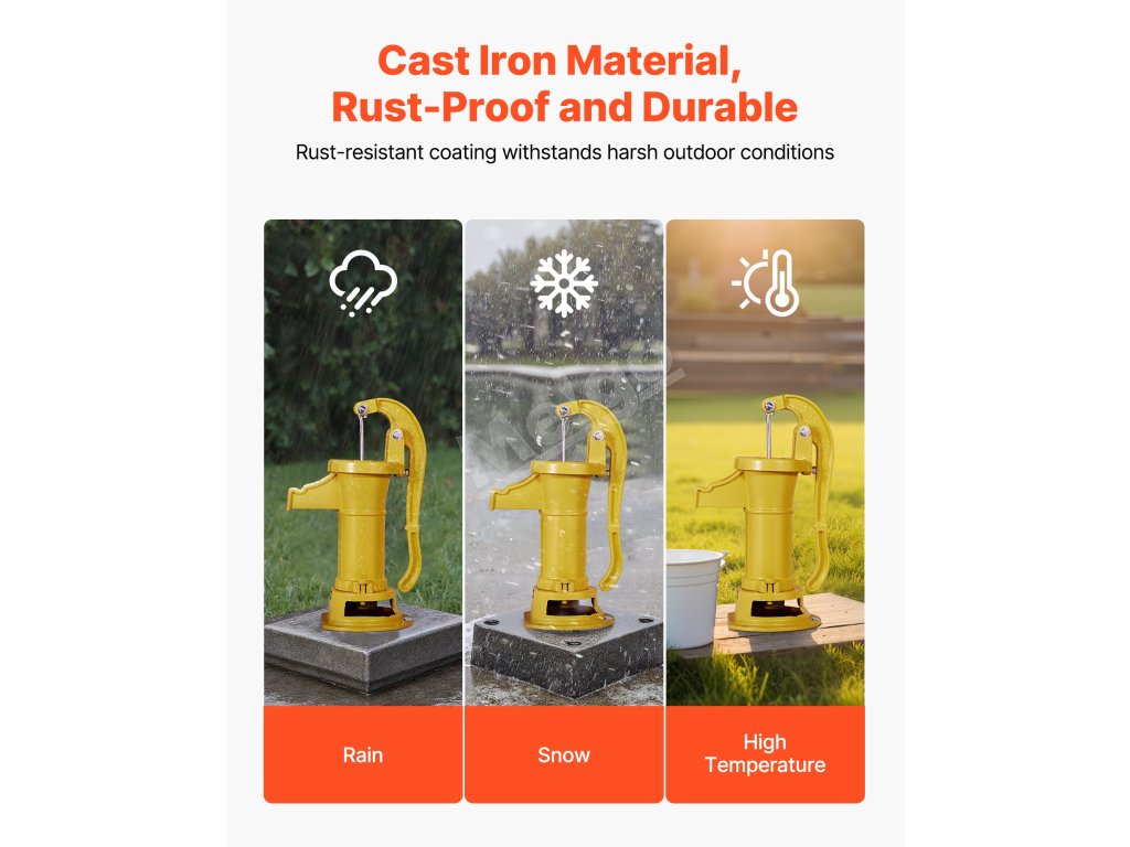 Toto ručné vodné čerpadlo z liatiny, vyrobené z prvotriednych materiálov, poskytuje stabilný a odolný výkon. Je odolná voči ohýbaniu a lámaniu pri častom používaní. Spoľahlivé tesnenie znižuje vnikanie vzduchu, čím sa zvyšuje účinnosť a rýchlosť vodného čerpadla.