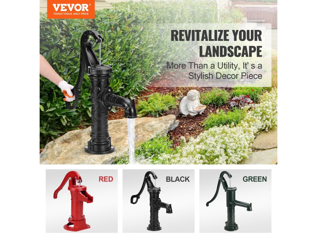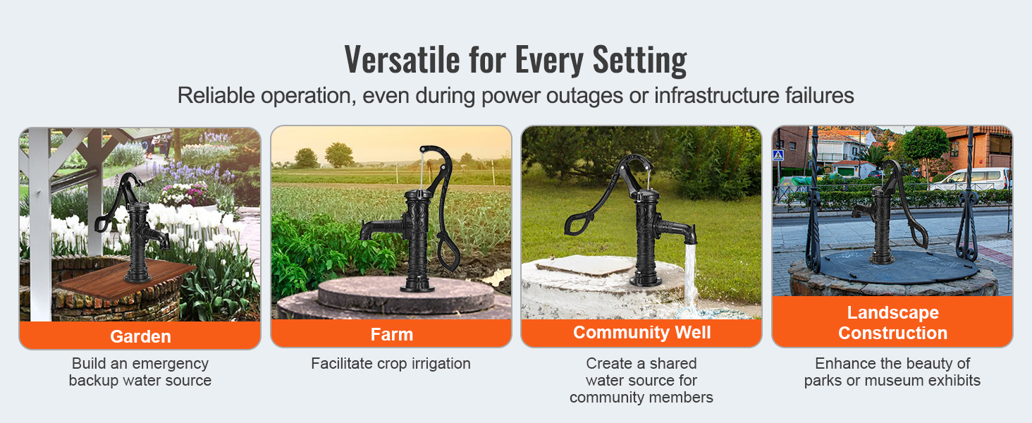 Naše ručné, manuálne vodné čerpadlo do studne bez problémov poslúži vašim potrebám vody od pokojnej rodinnej záhrady až po rozsiahle polia vašej farmy. Zabezpečte si prístup k vode kdekoľvek a kedykoľvek s riešením určeným pre každé prostredie.