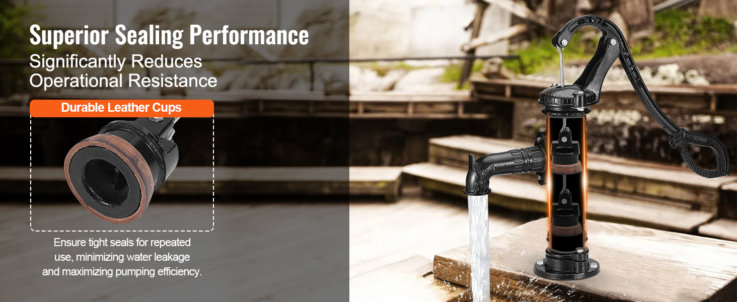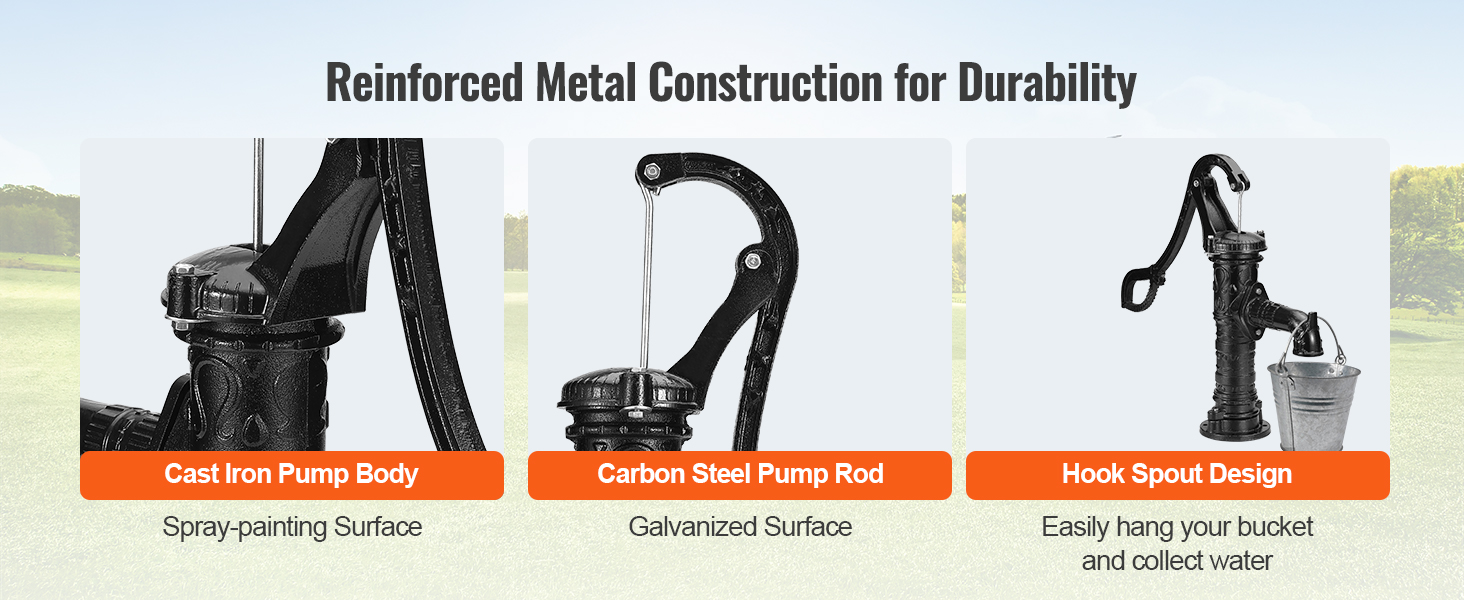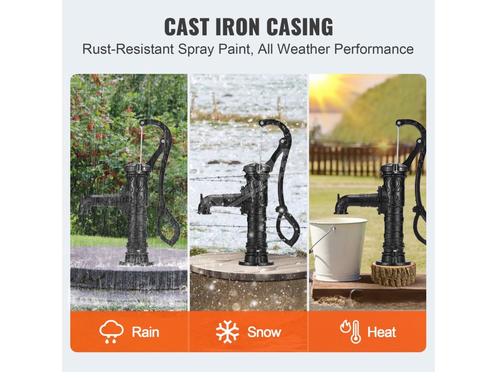 Naše ručné čerpadlo na vodu do studne je uzavreté v robustnom, vysokopevnostnom liatinovom tele, starostlivo ošetrenom antikoróznou vrstvou. To zaručuje optimálny výkon v rôznych podmienkach vrátane podmienok, ktoré sú vlhké alebo obsahujú určité chemikálie.