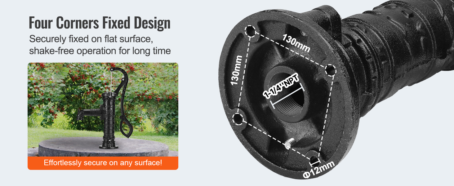 Naše starožitné ručné čerpadlo na vodu má symetricky navrhnutú základňu s otvorenými otvormi, ktorá umožňuje jednoduché upevnenie na rôzne povrchy pomocou niekoľkých skrutiek. Tento jednoduchý, ale účinný prístup zaručuje pevné nastavenie bez viklania a spoľahlivo zabezpečuje váš zdroj vody.
