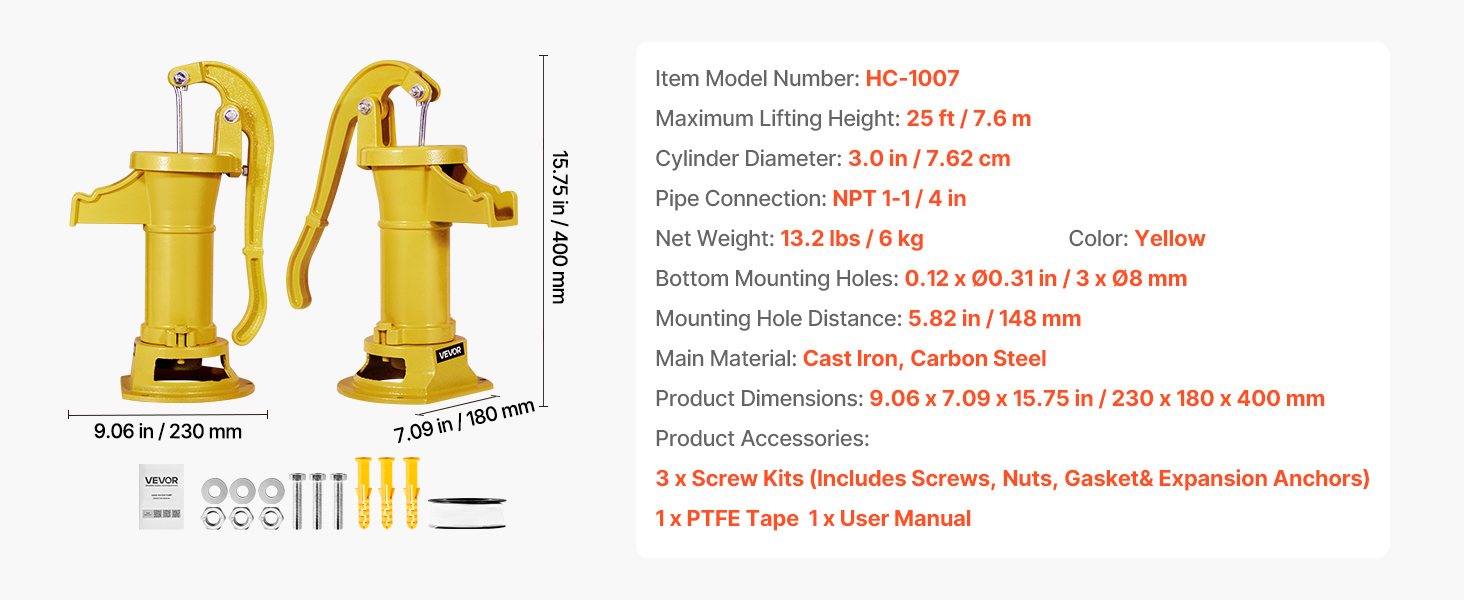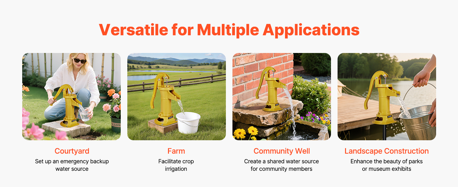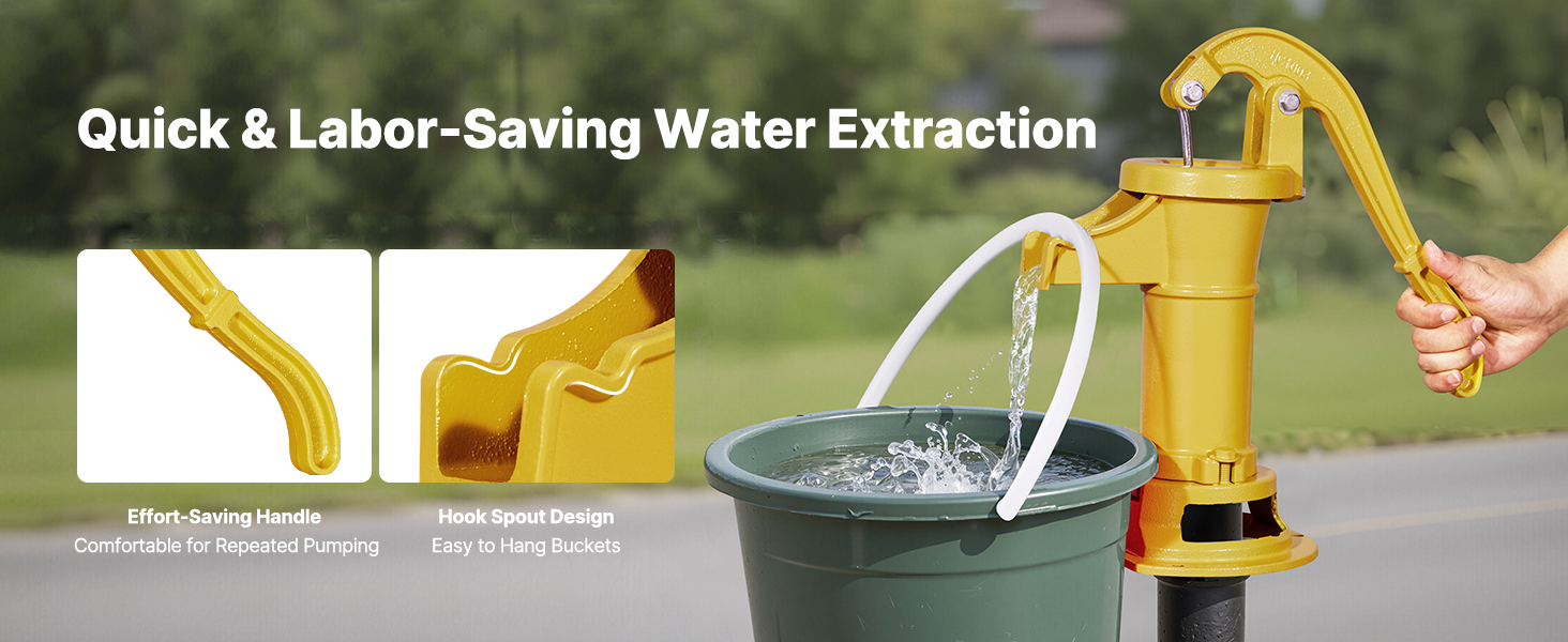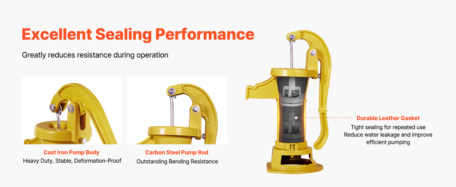 Toto ručné vodné čerpadlo z liatiny, vyrobené z prvotriednych materiálov, poskytuje stabilný a odolný výkon. Je odolná voči ohýbaniu a lámaniu pri častom používaní. Spoľahlivé tesnenie znižuje vnikanie vzduchu, čím sa zvyšuje účinnosť a rýchlosť vodného čerpadla.