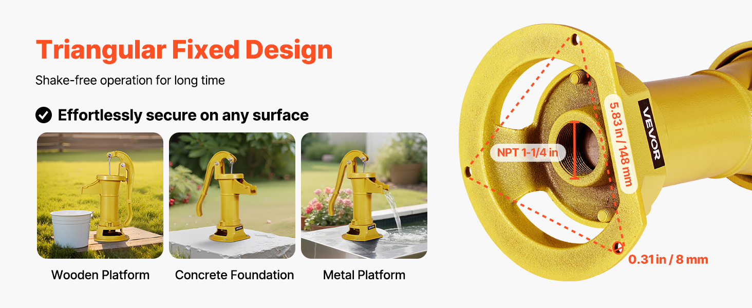 Džbánové čerpadlo pre základňu studne má konštrukciu s trojuholníkovým otvorom, možno ho bezpečne namontovať na rôzne rovné povrchy pomocou skrutiek. Ľahko sa inštaluje a pevne fixuje. Žiadne kolísanie, len stabilné čerpanie vody zakaždým.