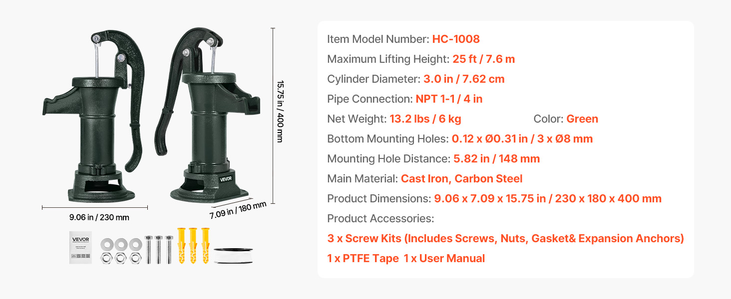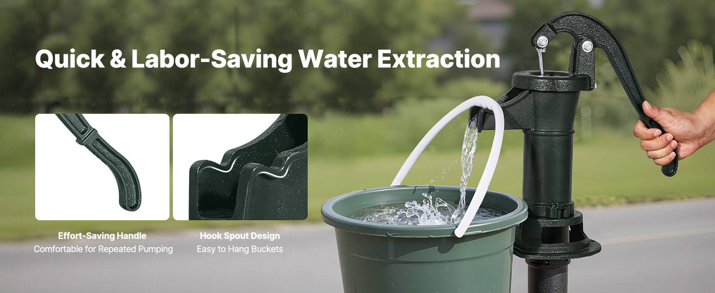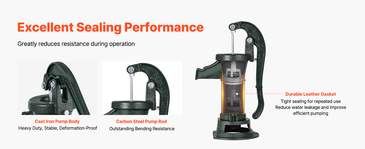 Toto ručné vodné čerpadlo z liatiny, vyrobené z prvotriednych materiálov, poskytuje stabilný a odolný výkon. Je odolná voči ohýbaniu a lámaniu pri častom používaní. Spoľahlivé tesnenie znižuje vnikanie vzduchu, čím sa zvyšuje účinnosť a rýchlosť vodného čerpadla.
