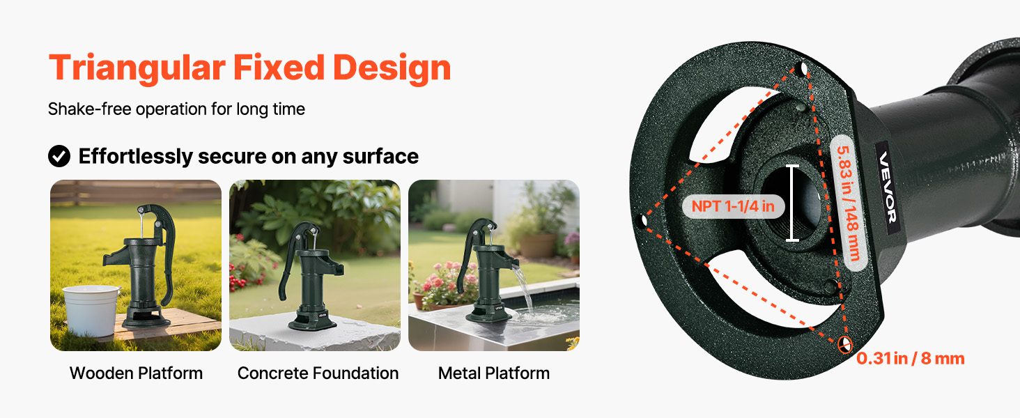 Džbánové čerpadlo pre základňu studne má konštrukciu s trojuholníkovým otvorom, možno ho bezpečne namontovať na rôzne rovné povrchy pomocou skrutiek. Ľahko sa inštaluje a pevne fixuje. Žiadne kolísanie, len stabilné čerpanie vody zakaždým.
