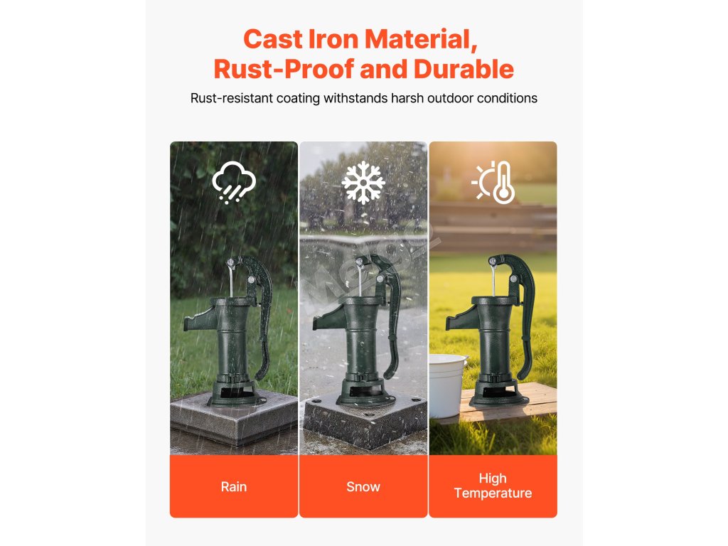 Toto ručné vodné čerpadlo z liatiny, vyrobené z prvotriednych materiálov, poskytuje stabilný a odolný výkon. Je odolná voči ohýbaniu a lámaniu pri častom používaní. Spoľahlivé tesnenie znižuje vnikanie vzduchu, čím sa zvyšuje účinnosť a rýchlosť vodného čerpadla.