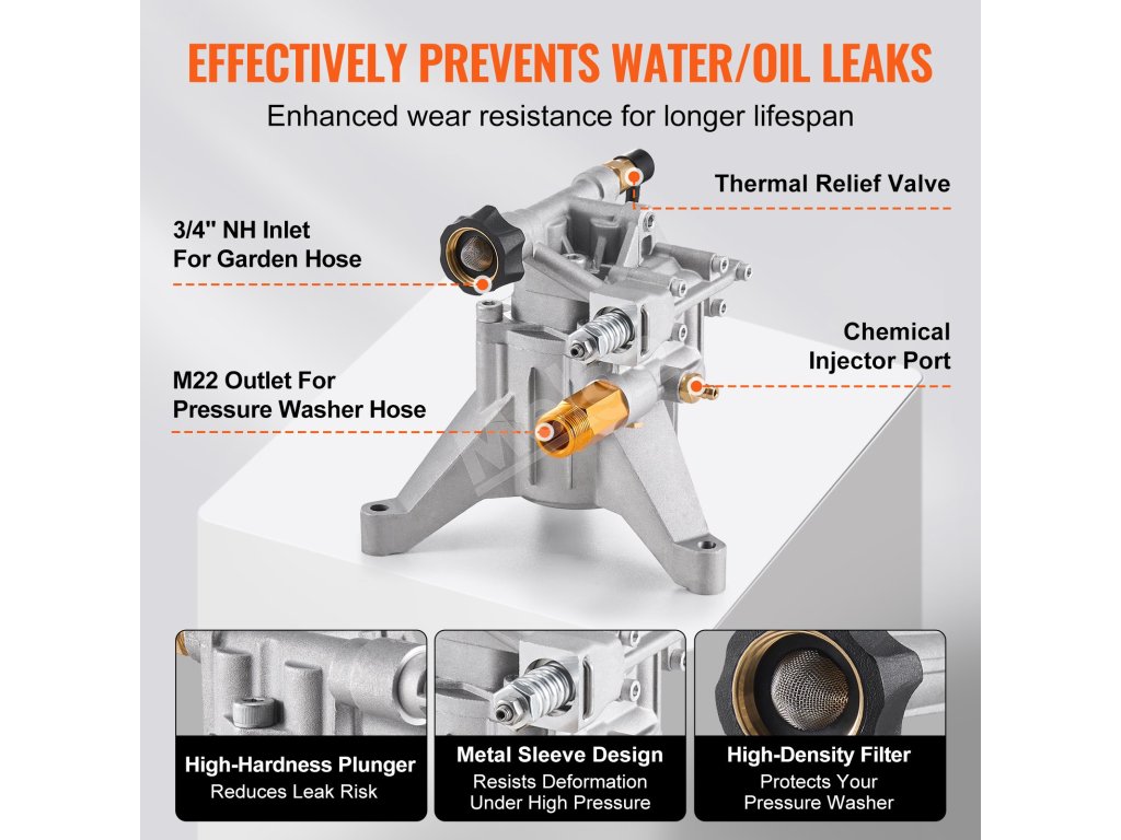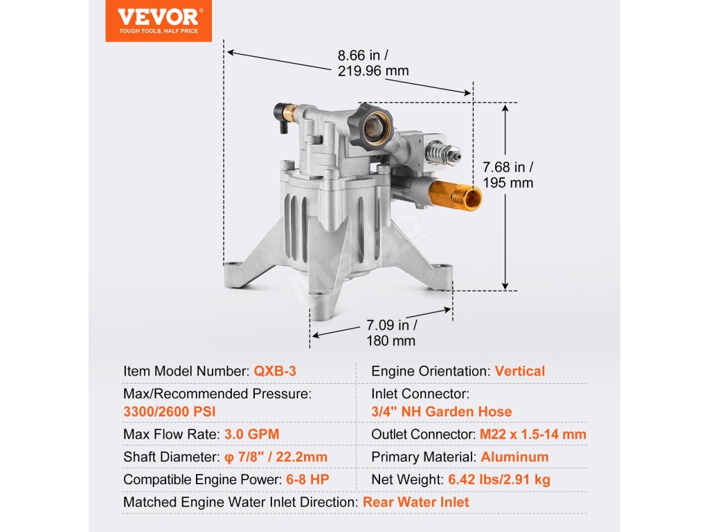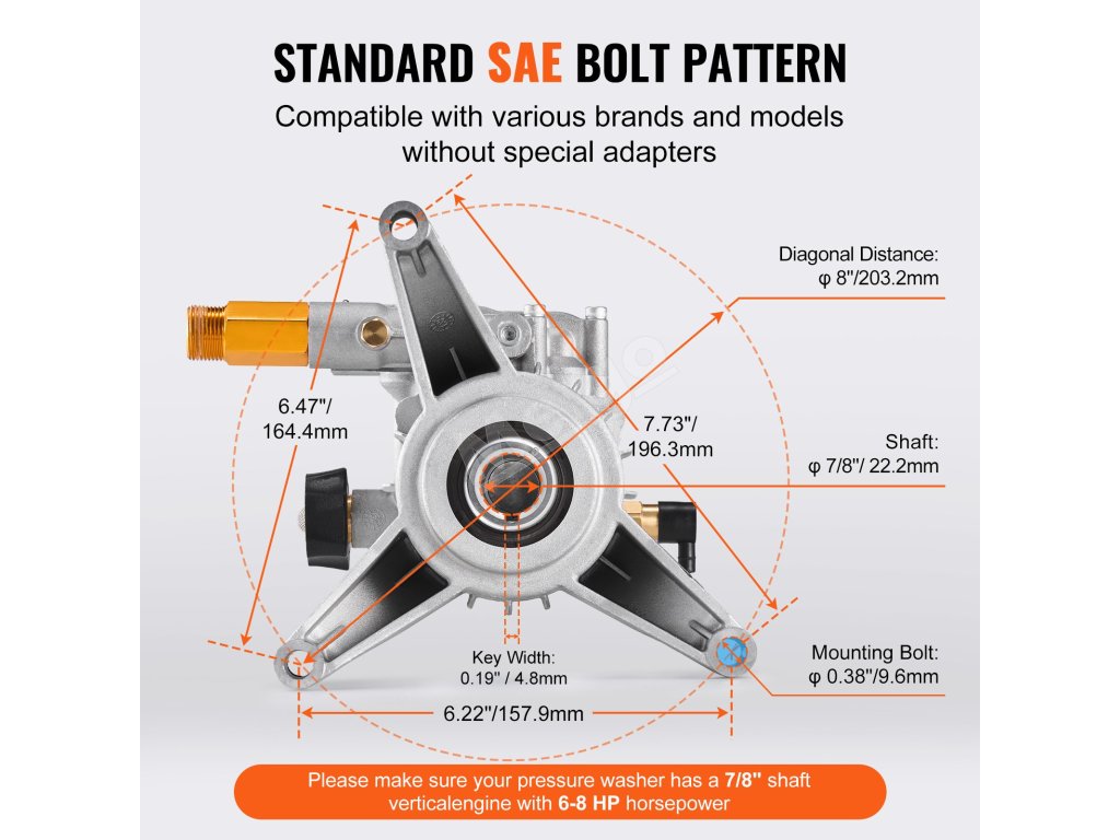 Vodné čerpadlo pre vysokotlakové umývačky je kompatibilné s väčšinou vysokotlakových umývačiek so zadným vývodom s objemom 196 - 230 cm3 vrátane modelov RYOBI, Honda, Briggs and Stratton, Subaru, PowerStroke, Craftsman, Simpson, Homelite.