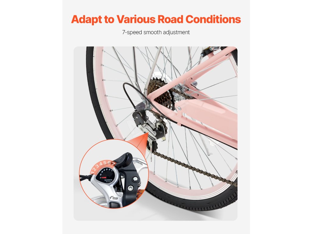 Tento cruiser je vybavený 7-rýchlostným prevodovým systémom, ktorý vám umožňuje ľahko prechádzať medzi rýchlosťami. Či už jazdíte po mestských uliciach, cestách v malých mestách alebo zdolávate mierne svahy, plynulé prechody medzi prevodmi poskytujú pohodlnú a efektívnu jazdu.