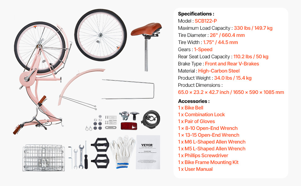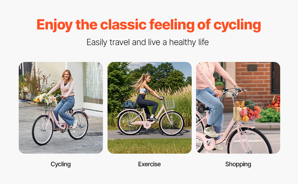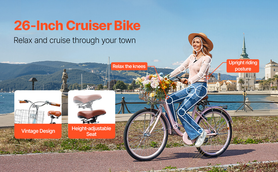 Tento štýlový retro cruiser bicykel má ergonomický dizajn, skladací košík s nepremokavou vložkou a robustný rám pre plynulú jazdu v meste a na predmestí. Jednorýchlostný systém sa ľahko používa, takže je ideálny pre seniorov, začiatočníkov a tých, ktorí majú stále trasy.