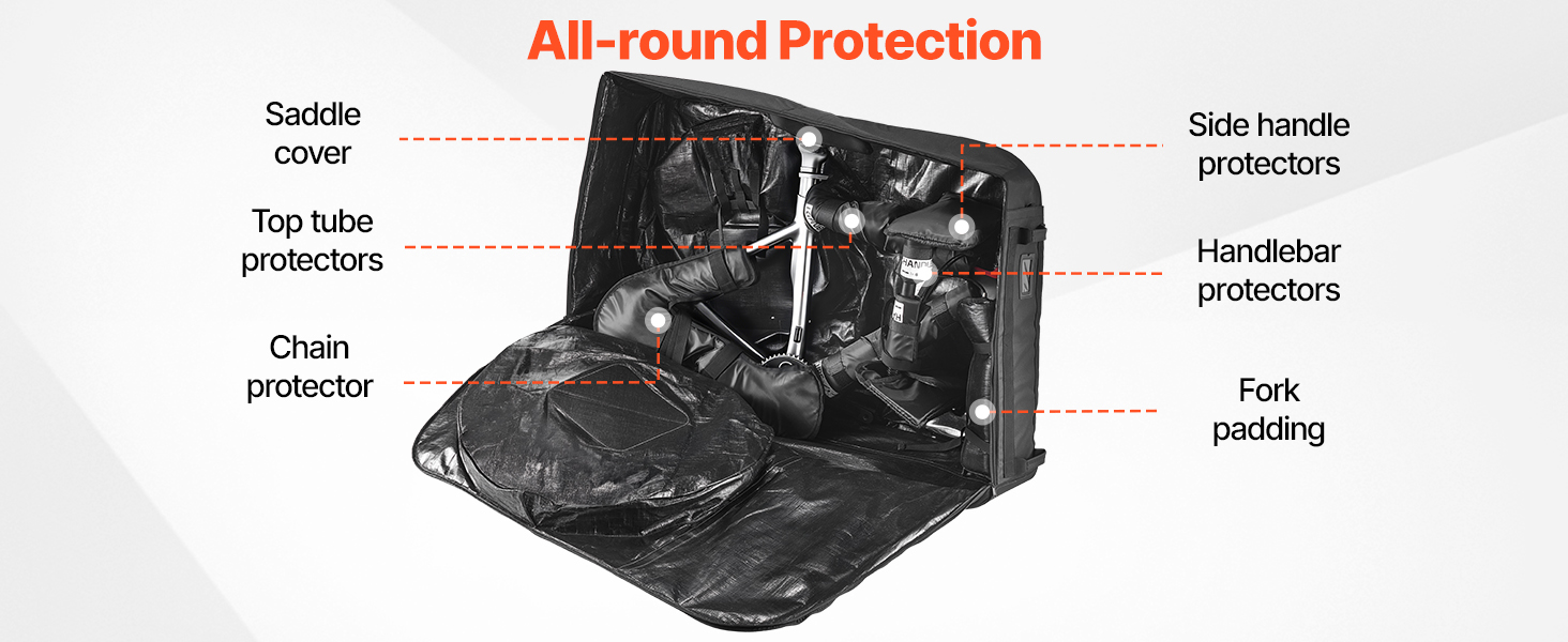 Táto cestovná taška na bicykel kombinuje odolný vonkajší materiál s úplným vnútorným polstrovaním. Pomáha odolávať odreninám, nárazom a otrasom. Obopína rám, vidlicu a kolesá a poskytuje komplexnú ochranu pri každej ceste.