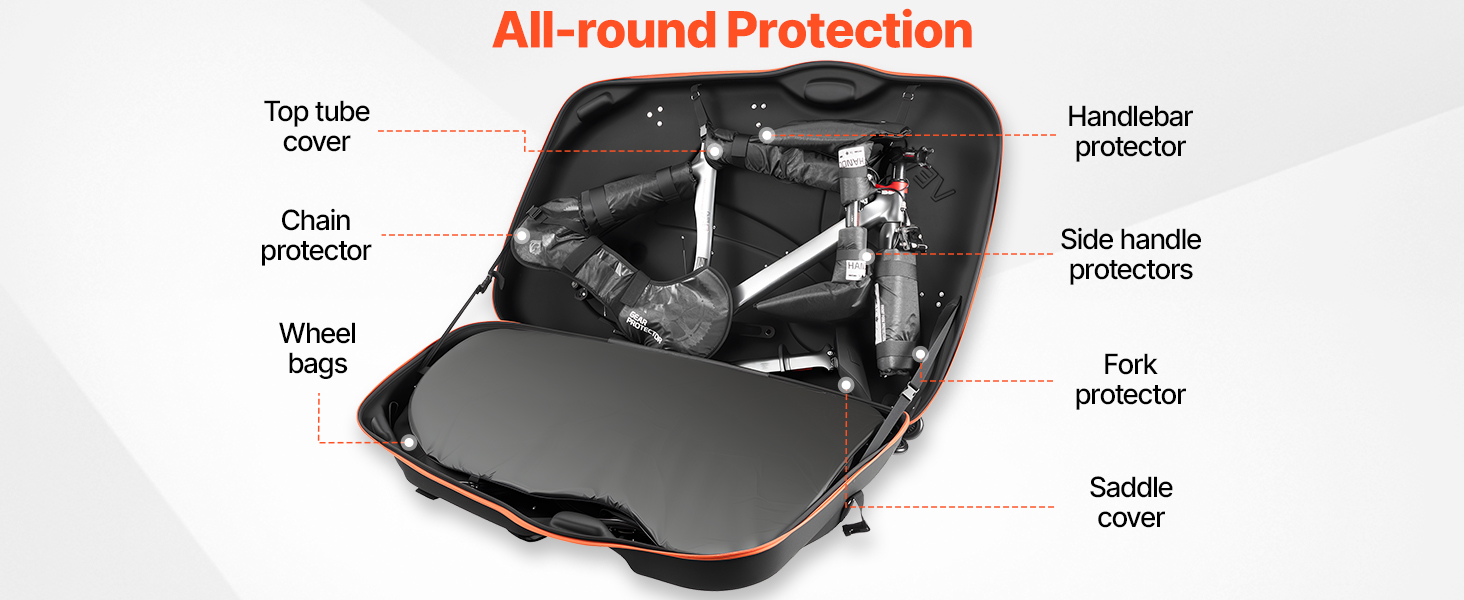 Pevná EVA škrupina v kombinácii s úplným vnútorným polstrovaním pomáha odolávať odreninám, nárazom a otrasom. Puzdro na bicykel obklopuje rám, vidlicu a kolesá, čím zabezpečuje spoľahlivú ochranu zo všetkých strán.