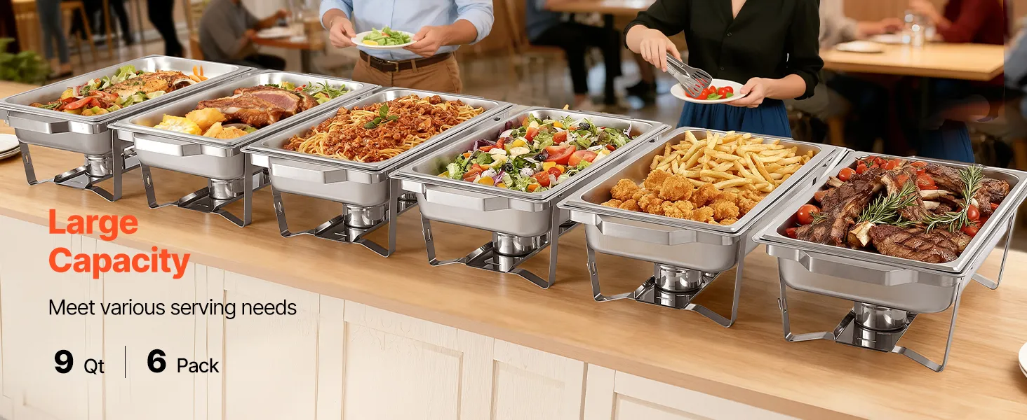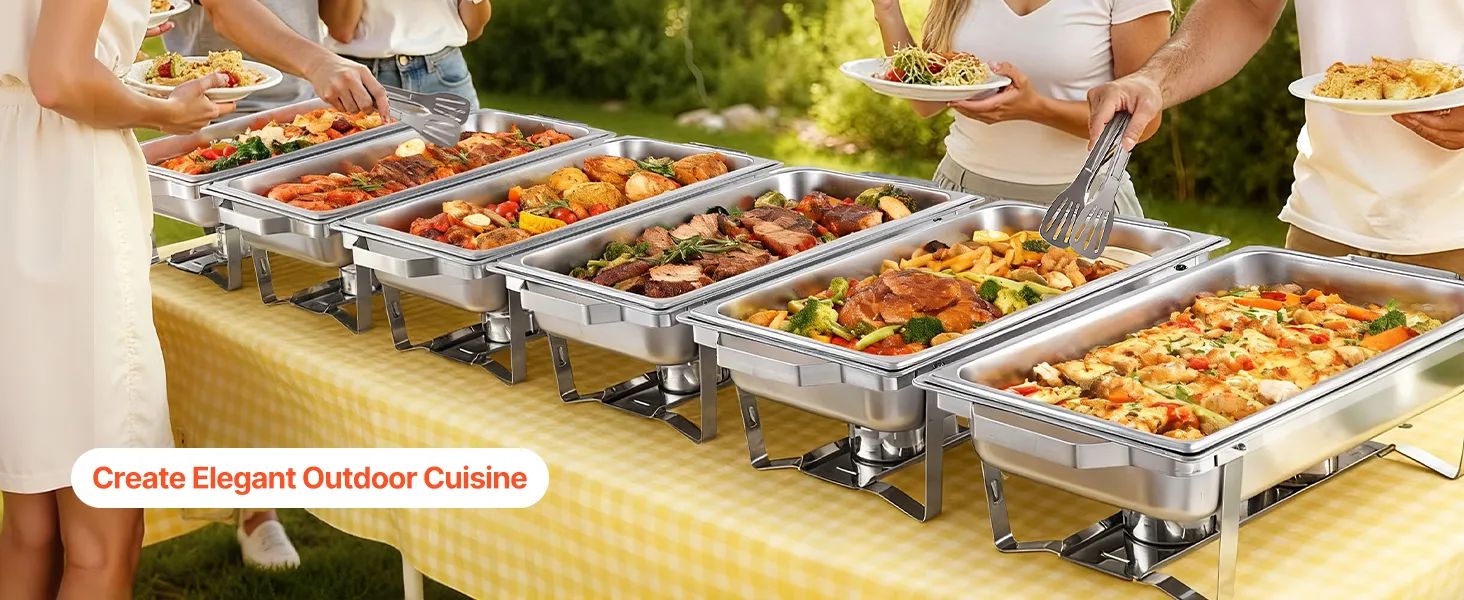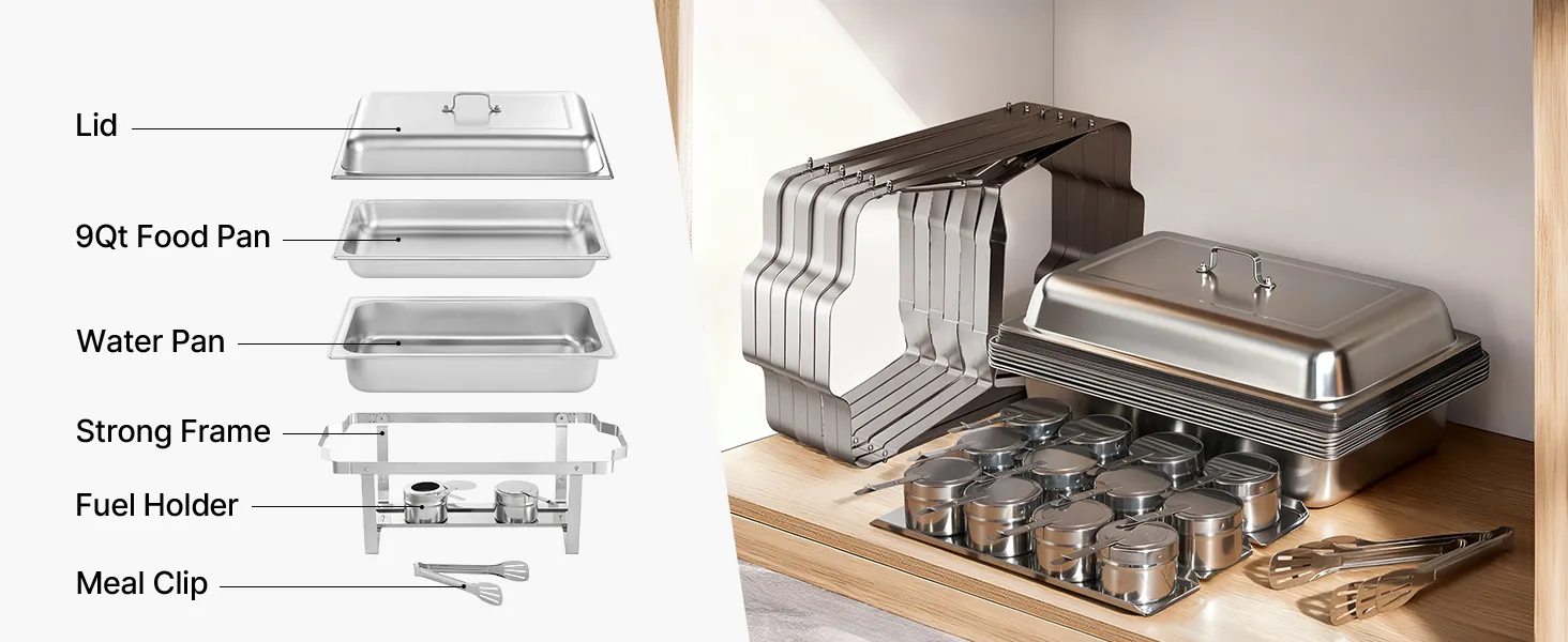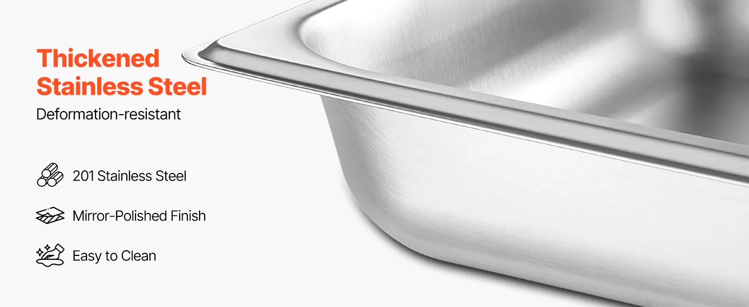 Ohrevný podnos na jedlo 9.91L nerezová sada 6 ks s vekom a držiakom