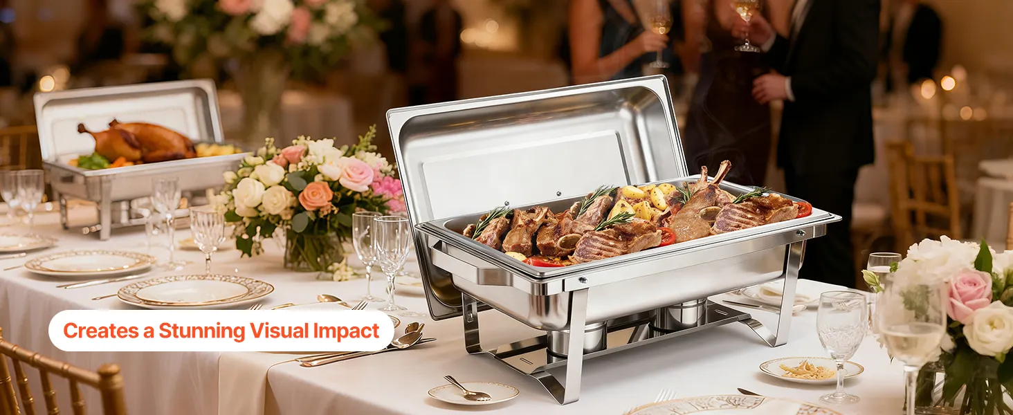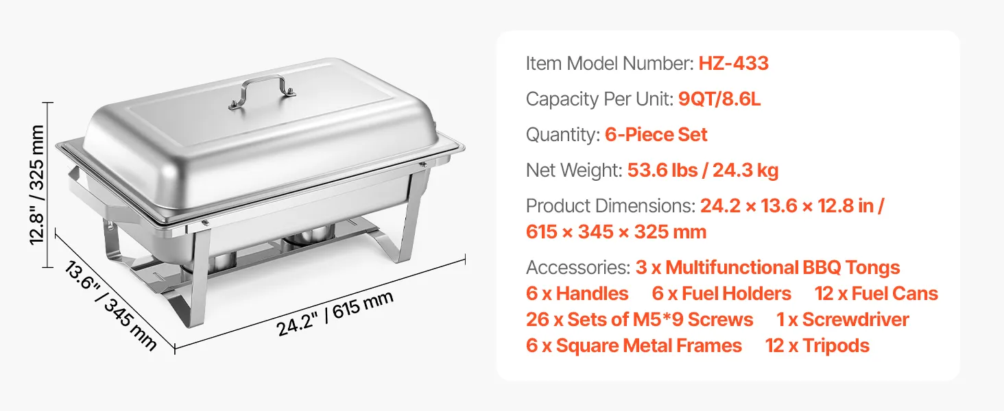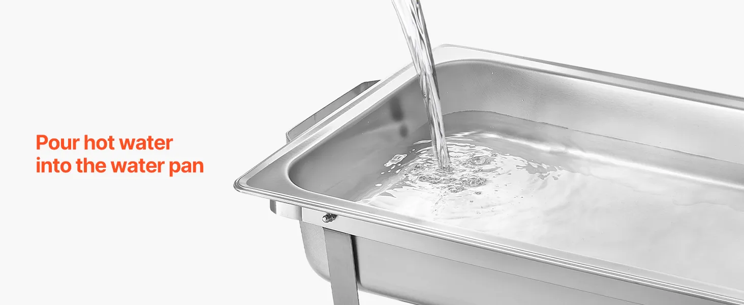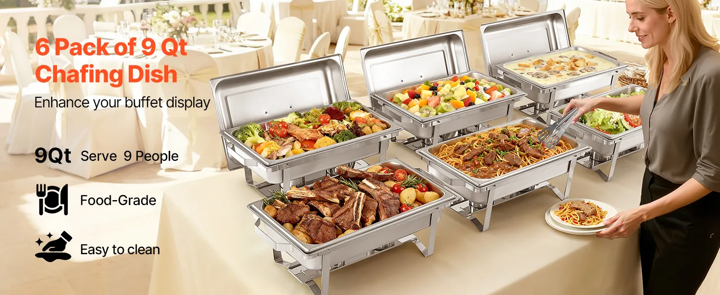 Ohrevný podnos na jedlo 9.91L nerezová sada 6 ks s vekom a držiakom