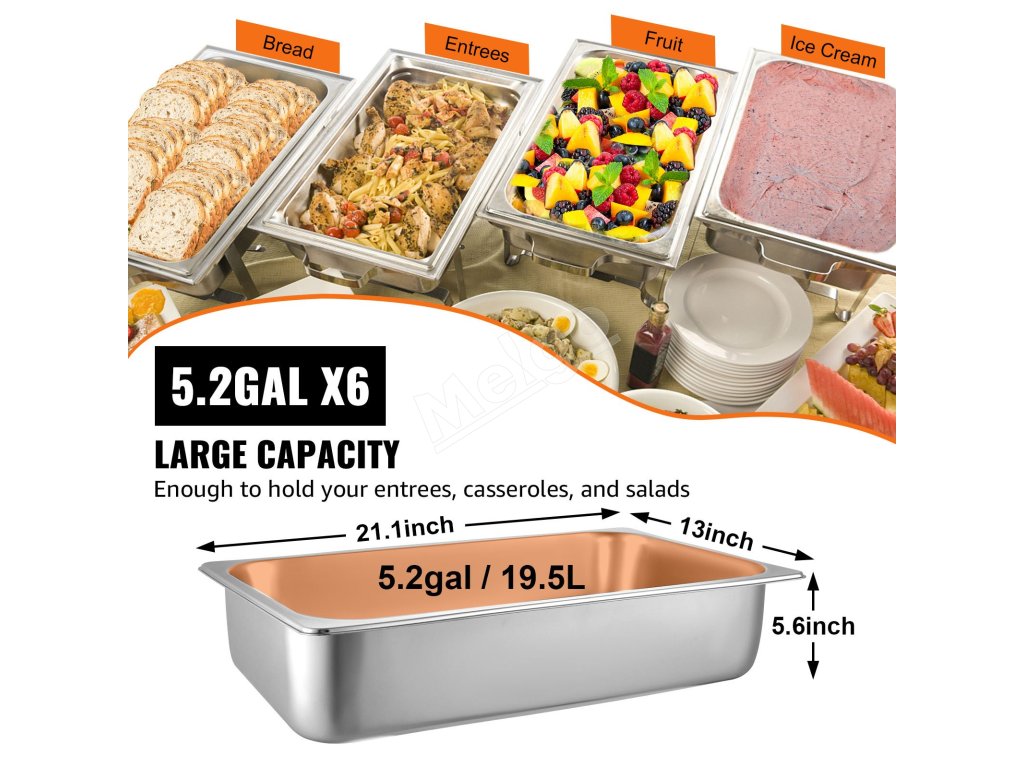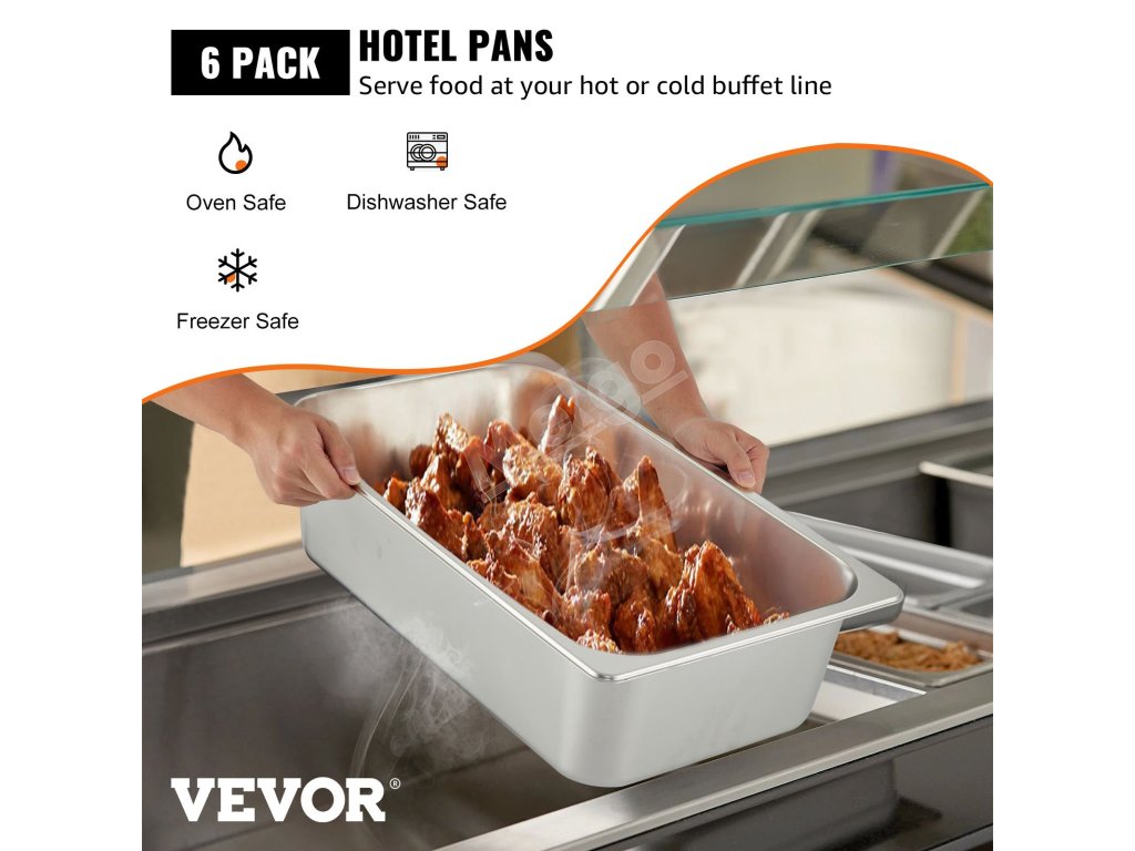 Naše parné stolové panvice VEVOR s rozmermi 20,9 x 12,8 x 5,9 palca sú vyrobené z vysoko kvalitnej nehrdzavejúcej ocele. To zaručuje odolnosť a dlhú životnosť. S objemom 31 galónov alebo 11 litrov poskytujú tieto panvice dostatok priestoru pre všetky vaše cateringové potreby. Súprava obsahuje šesť balení panvíc. Sú ideálne na veľké podujatia. Ich hrúbka 22 hrúbok im dodáva na robustnosti. Do celkovej veľkosti 21,1 x 13 x 5,6 palca sa zmestia rôzne potraviny.