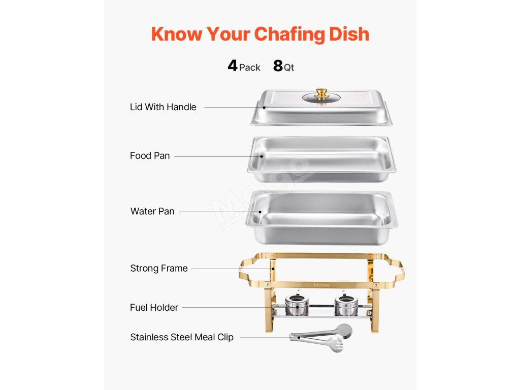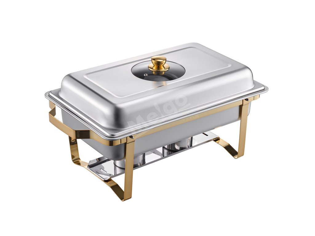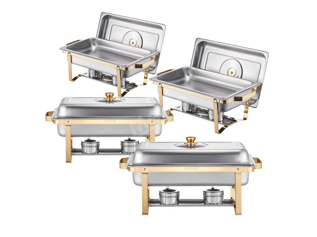 Sada chaferov 4×8 qt nerez, 4 plné panvy, sklenené veko, stojan