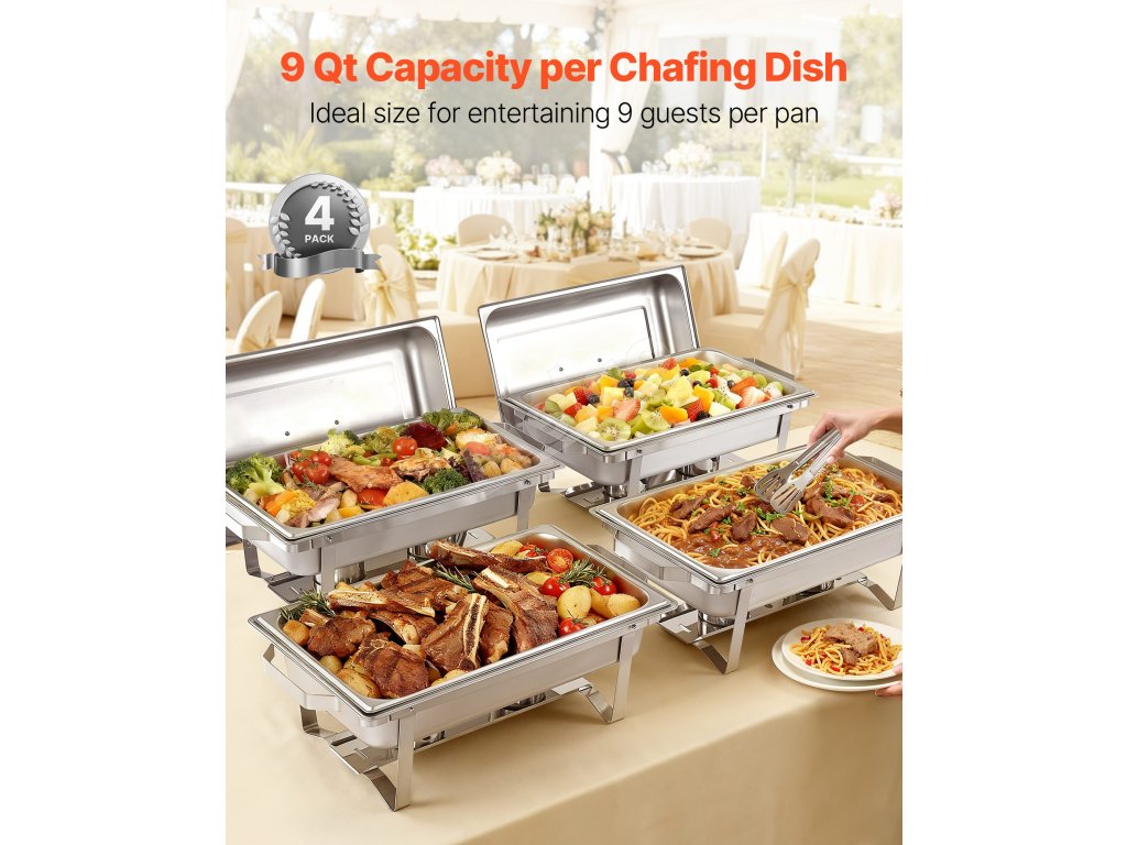 Pripravte a servírujte viacero pokrmov s našou 4-dielnou 9-kapacitnou obdĺžnikovou súpravou na zapekanie. Je vhodná na komerčné aj domáce použitie, pojme rôzne jedlá na bufety, brunche, cateringové podujatia, svadby, rodinné oslavy alebo večierky a poskytuje prehľadné a elegantné servírovanie.