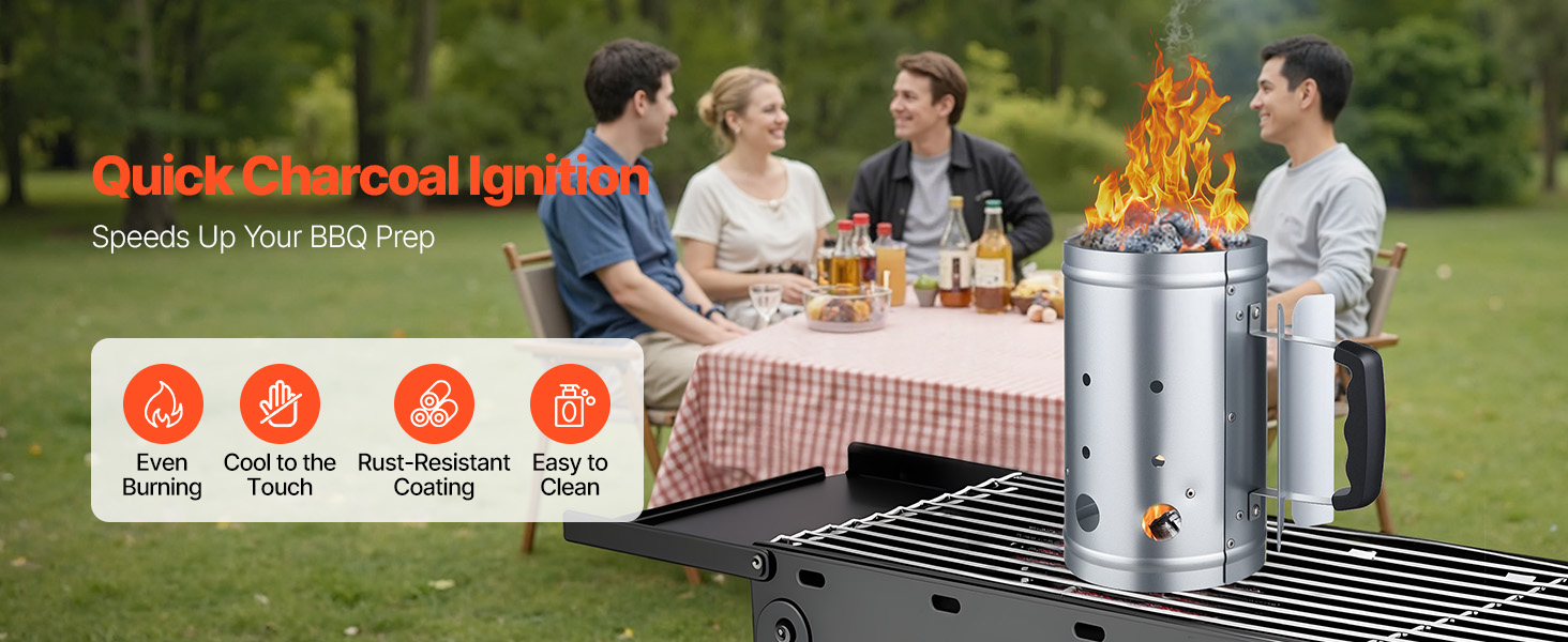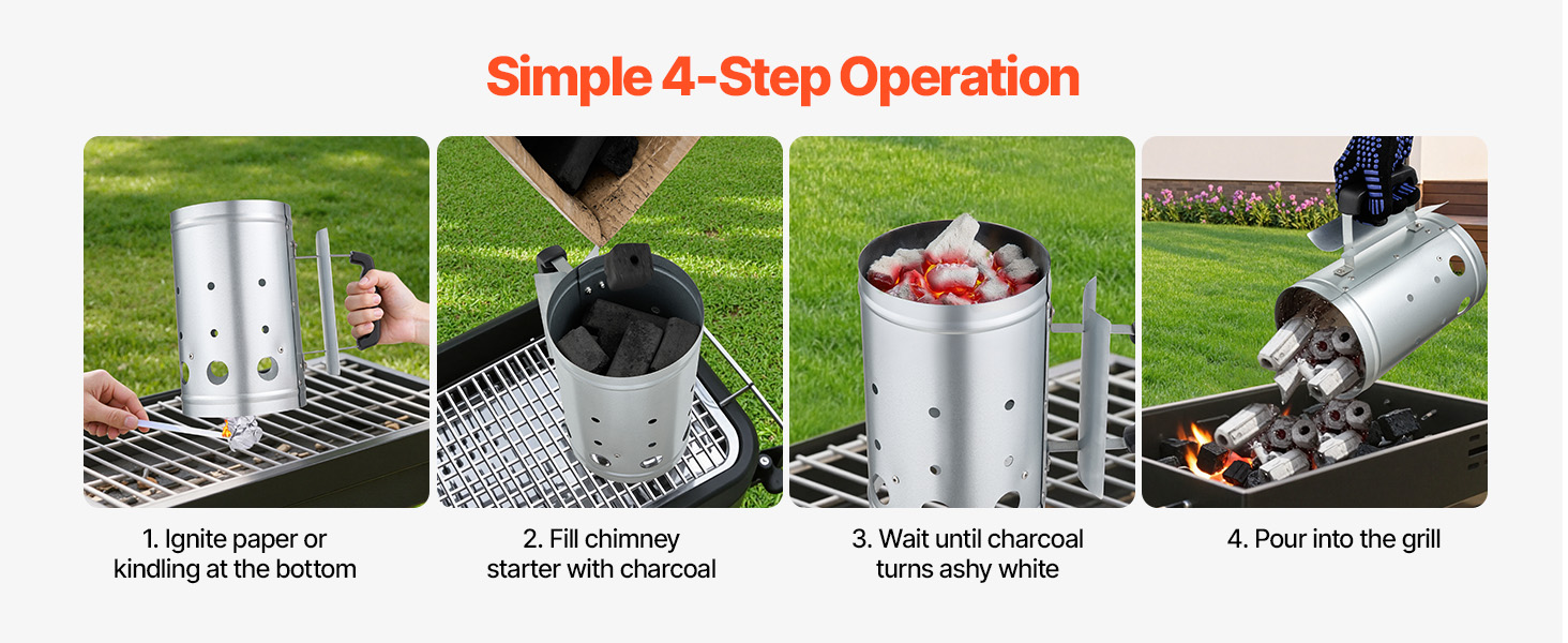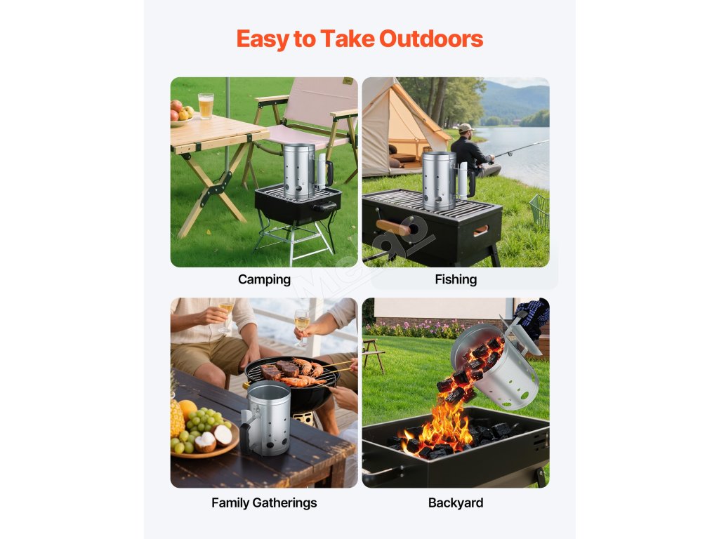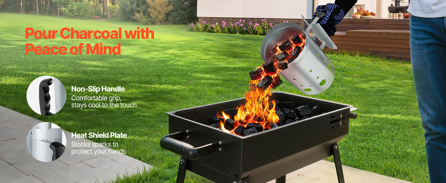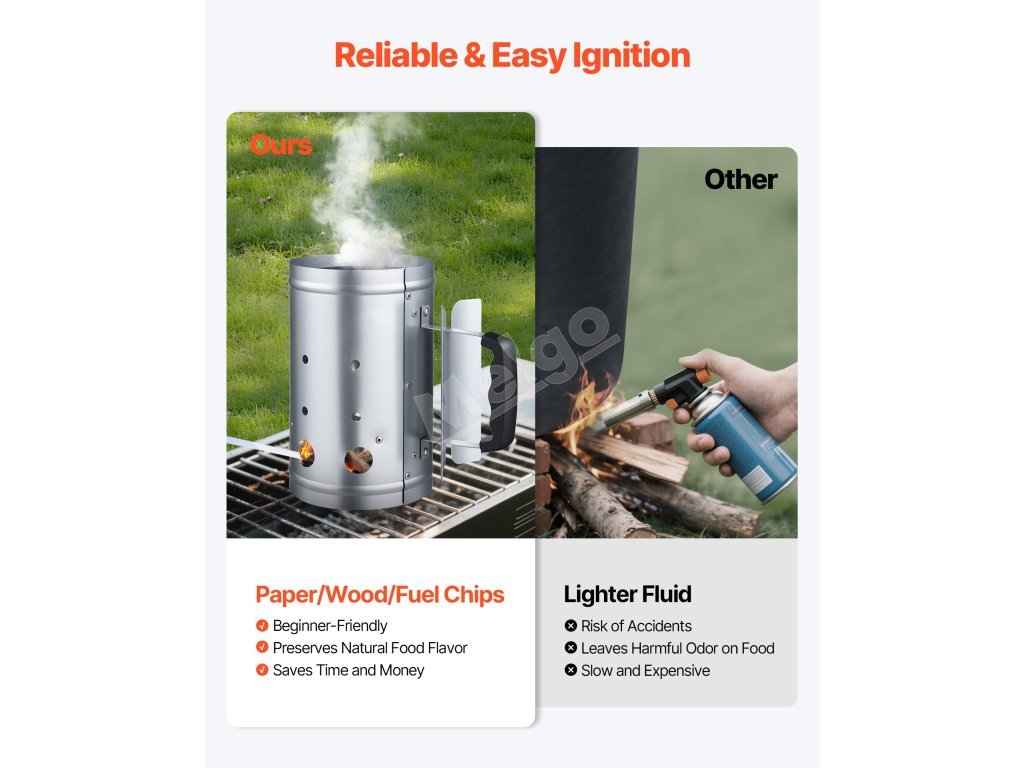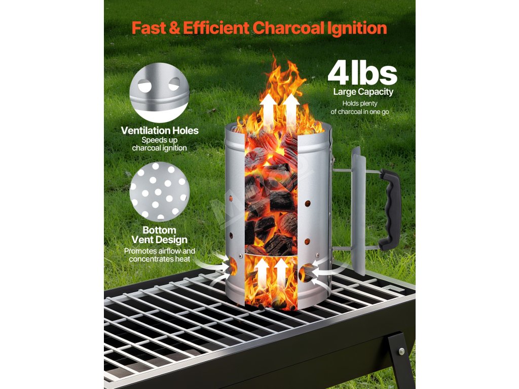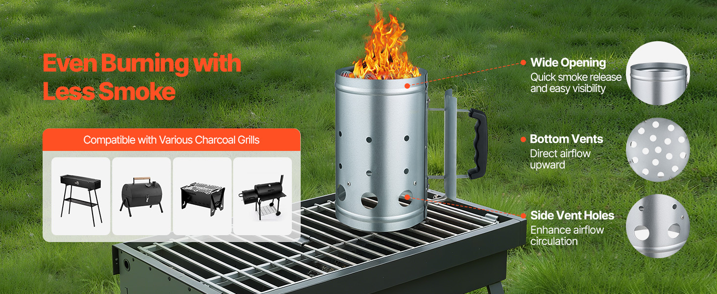 Náš zapaľovač dreveného uhlia má otvor s veľkým priemerom, ktorý umožňuje rýchly únik dymu bez toho, aby sa hromadil, vďaka čomu je možné ľahko pozorovať, ako drevené uhlie sčervená. Za krátky čas je pripravený na nalievanie do rôznych grilov na drevené uhlie.