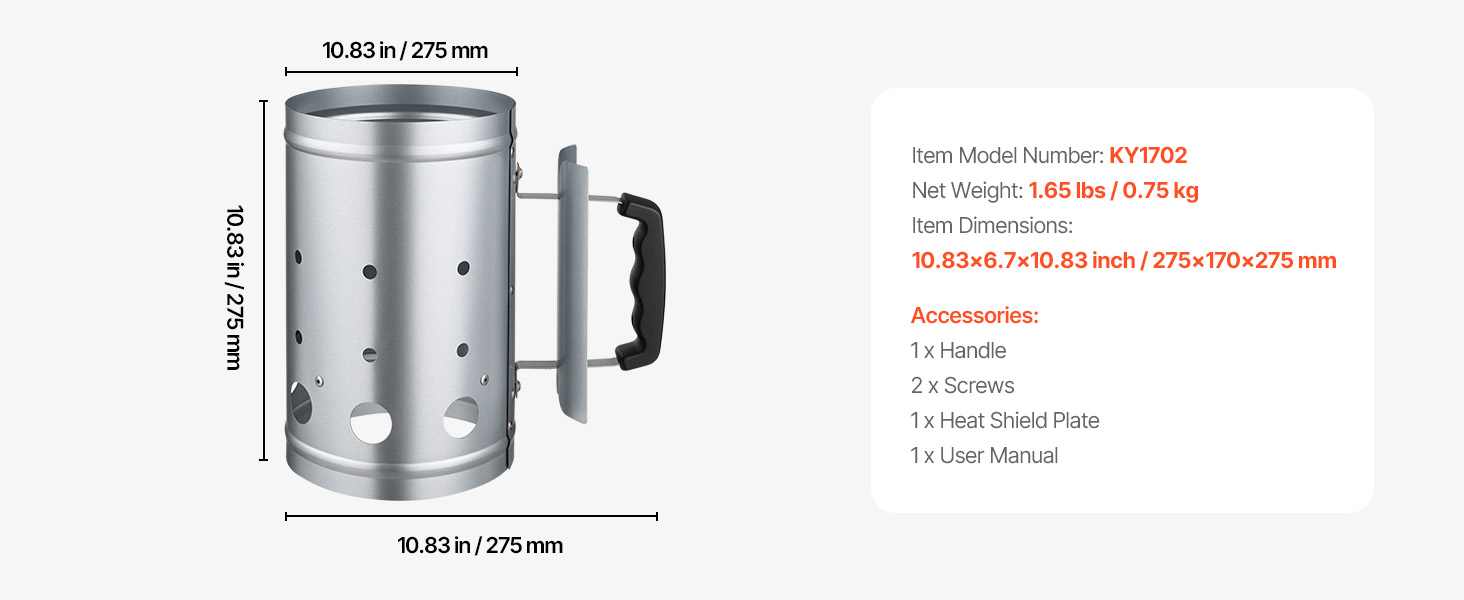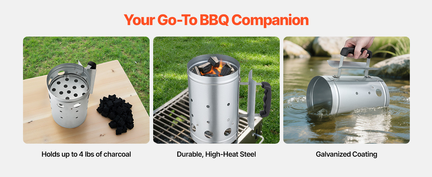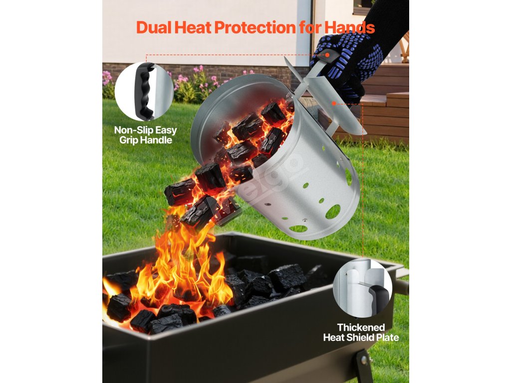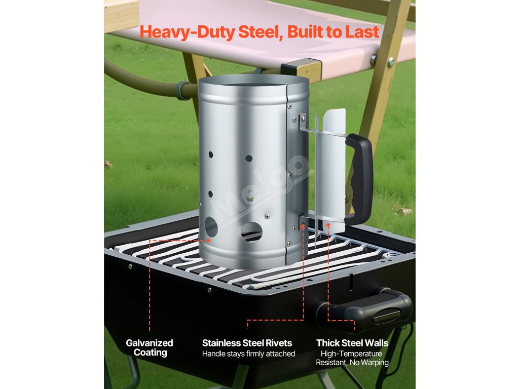 Tento podpaľovač na grilovanie vyrobený z hrubej ocele odoláva extrémnym teplotám bez deformácie alebo praskania. Pozinkovaný povrch navyše poskytuje dodatočnú ochranu. Poznámka: Po použití nechajte komín na drevené uhlie prirodzene vychladnúť; použitie vody môže spôsobiť tepelný šok a skrátiť jeho životnosť.
