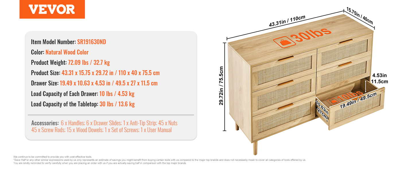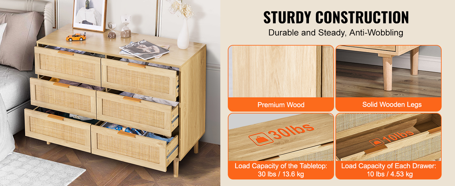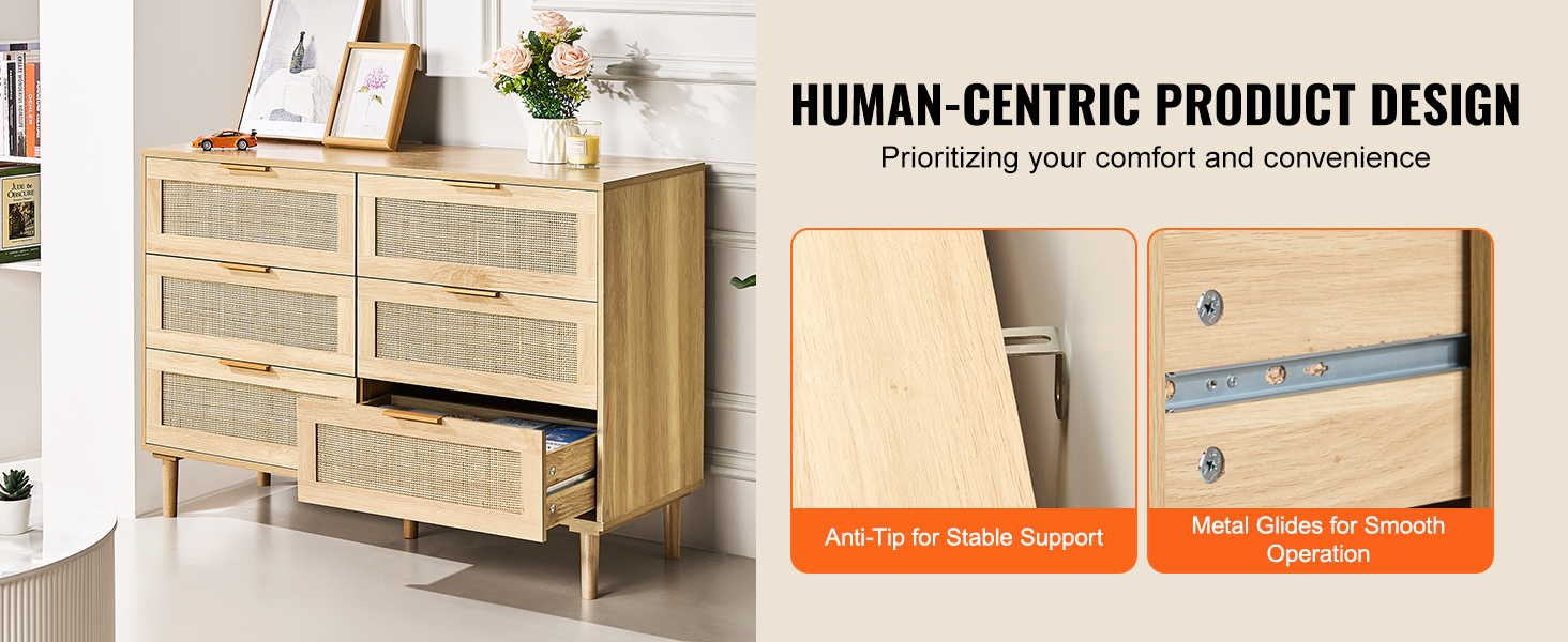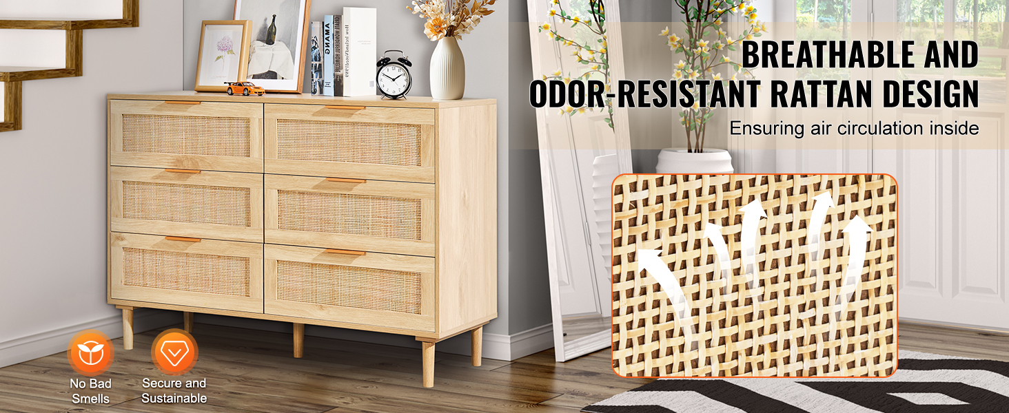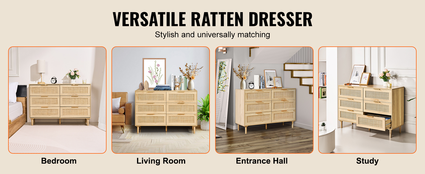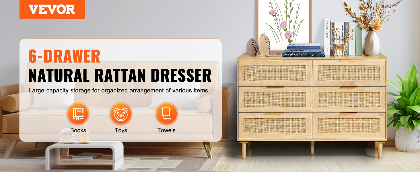 Ratanová komoda VEVOR kombinuje ratan s robustným drevom na usporiadanie vašich vecí. Je univerzálna pre každú miestnosť, funguje ako toaletný stolík, nočný stolík, TV stolík alebo stolík v predsieni a dodá vášmu domovu šarm a praktickosť!