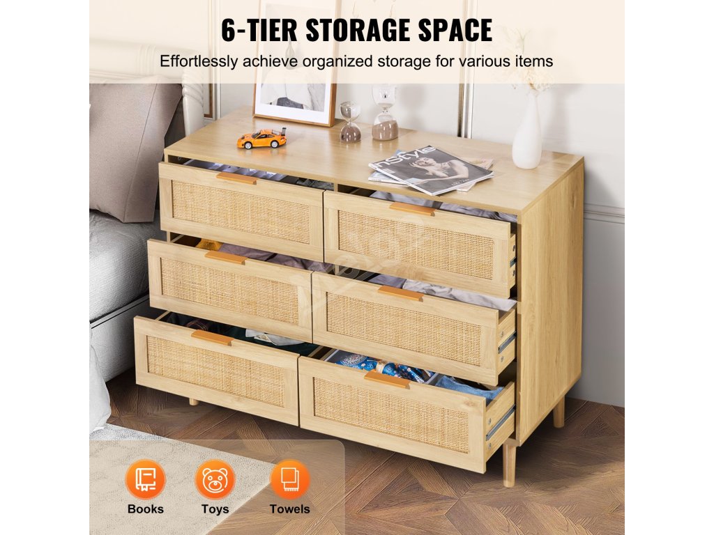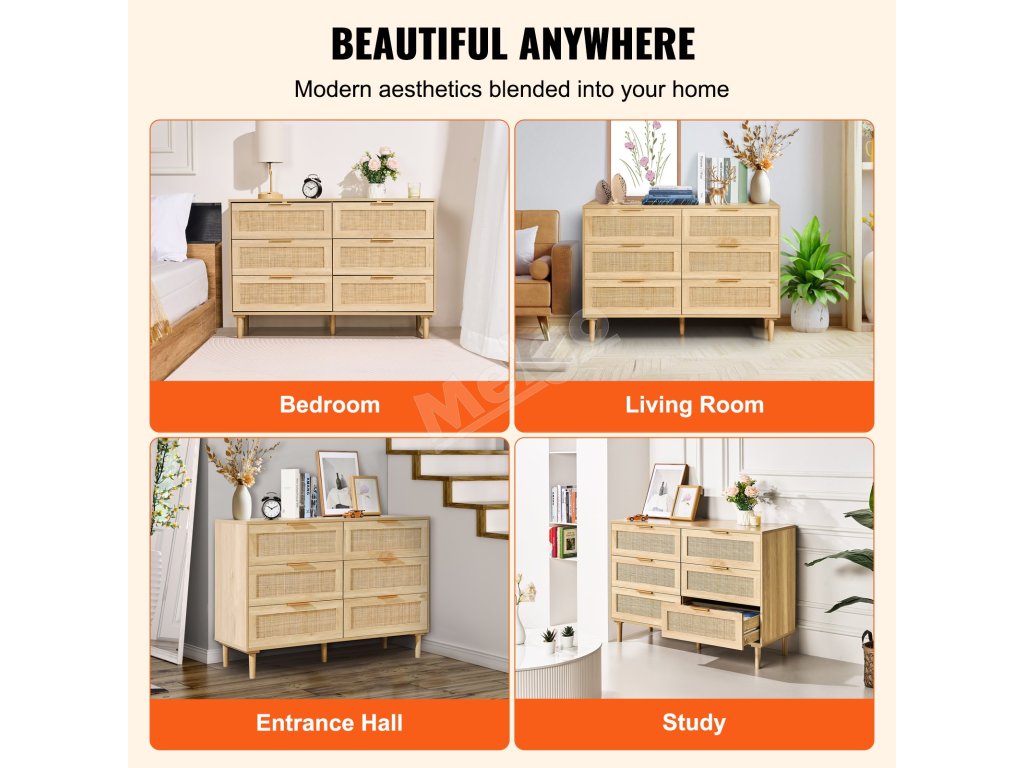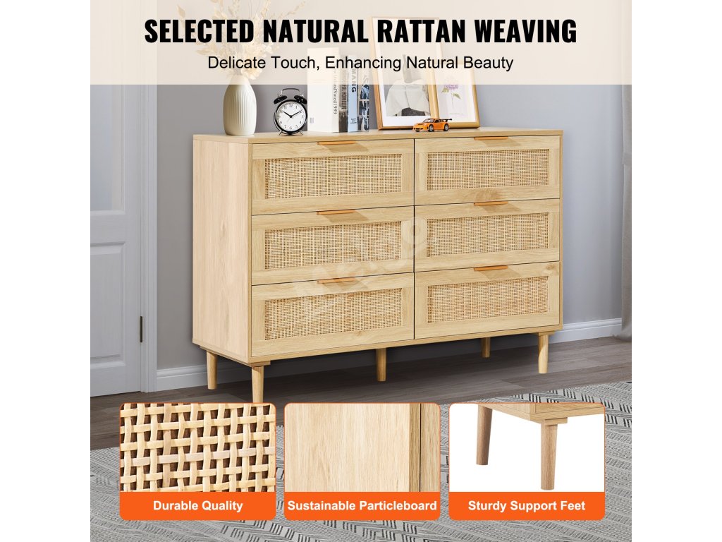 Ratanová komoda VEVOR kombinuje ratan s robustným drevom na usporiadanie vašich vecí. Je univerzálna pre každú miestnosť, funguje ako toaletný stolík, nočný stolík, TV stolík alebo stolík v predsieni a dodá vášmu domovu šarm a praktickosť!