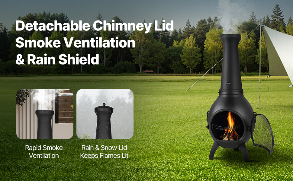Odnímateľný poklop komína na tomto vonkajšom ohnisku ponúka viacero možností využitia podľa vašich potrieb: odnímte poklop na rýchle odvetranie dymu alebo ho nechajte počas dažďa či sneženia, aby ste sa vyhli zhasnutiu ohňa, čo vám zaručí, že si budete môcť vychutnávať chvíle vonku bez obáv.