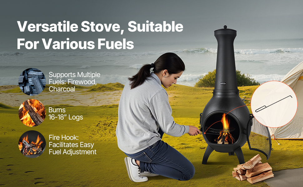 Naša veľká komína podporuje rôzne palivá, ako je drevo a drevené uhlie, a pojme 16-18" polená. Priložený pohrabáč na oheň uľahčuje nastavenie paliva, čím zabezpečuje efektívnejšie spaľovanie.
