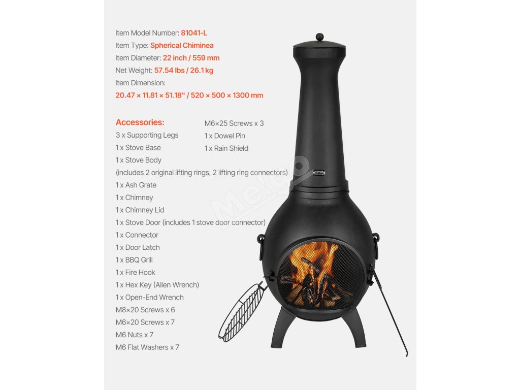 Chiminea 22 inch guľatá záhradná pec na drevo s grilom a komínom