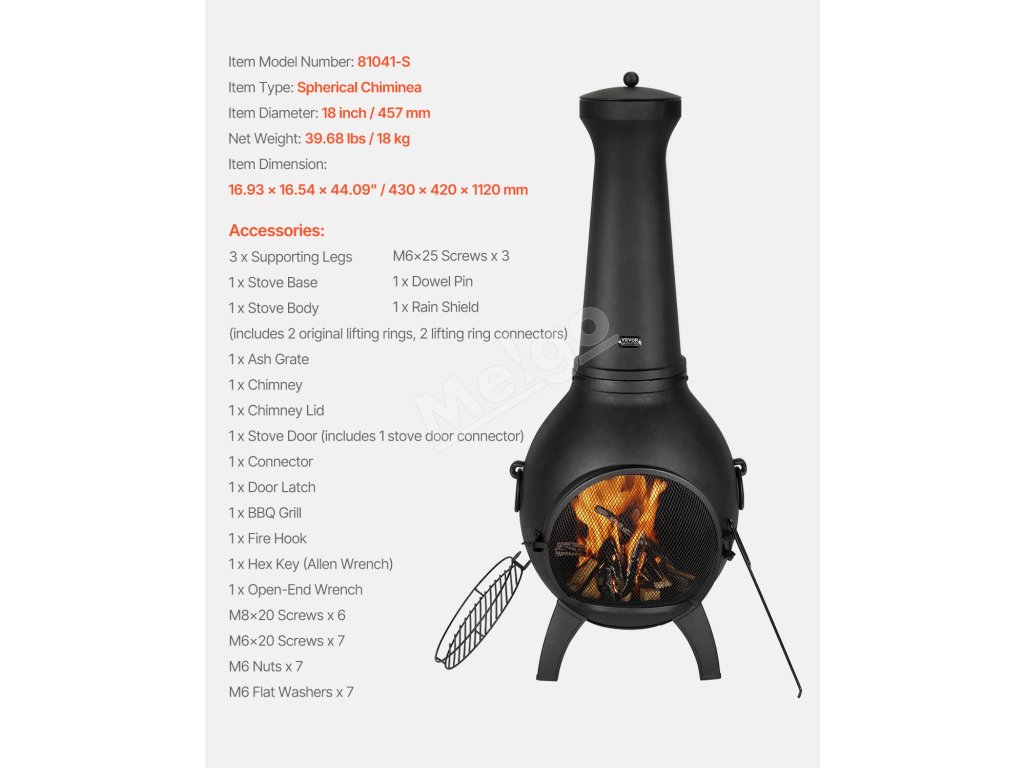 Vylepšite svoje outdoorové zážitky s našou odolnou chimineou, ktorá je odolná voči vysokým teplotám! Je vyrobená z prvotriednych materiálov a dodáva sa s vodotesným skladovacím plášťom na dlhodobé používanie. Vďaka 18-palcovému guľovému dizajnu s priehľadnou sieťovinou si môžete vychutnávať plamene, zatiaľ čo vďaka varnej ploche je grilovanie hračka.