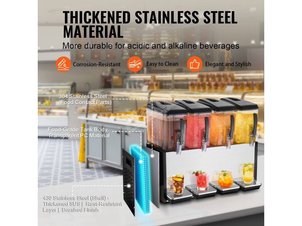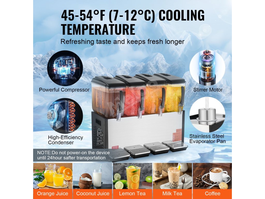 Vďaka stabilnému výkonu kompresora a výkonnej prevádzke šetrí čas a energiu. Výparník rýchlo mrzne a počas chladenia udržiava teplotu šťavy v rozmedzí 45-54 °F (7 ~ 12 ℃). Vybavený nezávislými spínačmi na samostatné ovládanie miešania a chladenia.