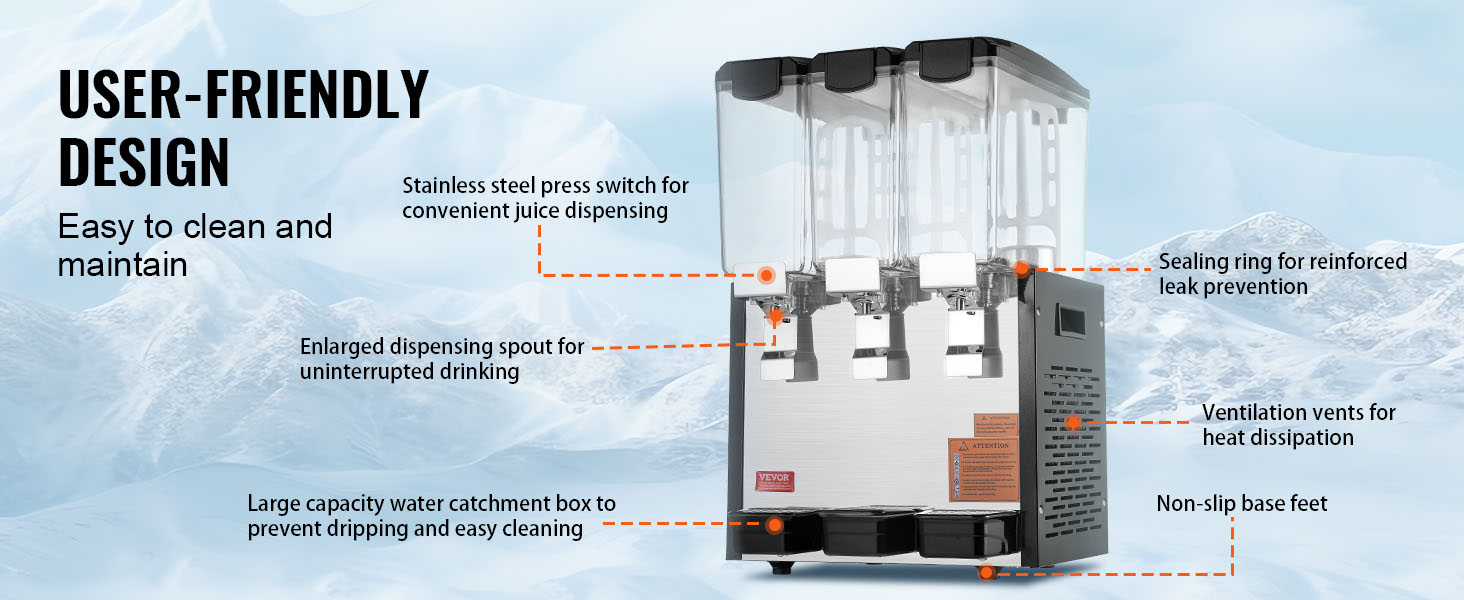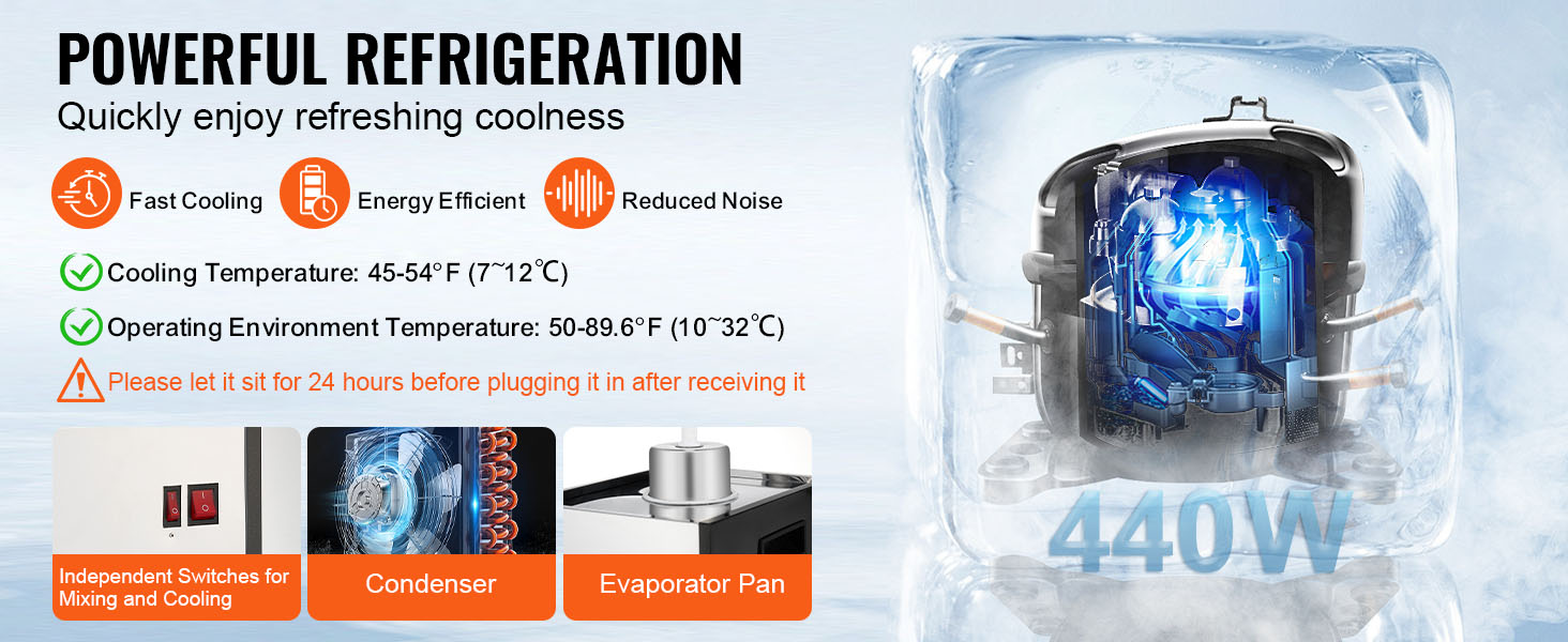 Vďaka stabilnému výkonu kompresora a výkonnej prevádzke šetrí čas a energiu. Výparník rýchlo mrzne a počas chladenia udržiava teplotu šťavy v rozmedzí 45-54 °F (7 ~ 12 ℃). Vybavený nezávislými spínačmi na samostatné ovládanie miešania a chladenia.