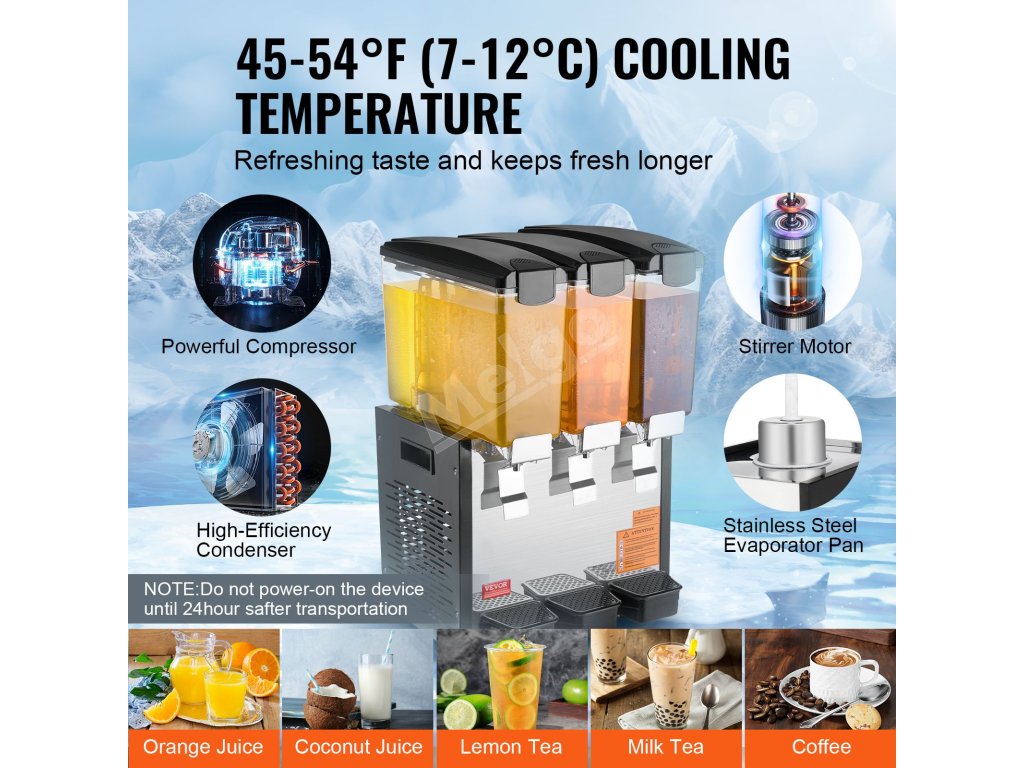 Vďaka stabilnému výkonu kompresora a výkonnej prevádzke šetrí čas a energiu. Výparník rýchlo mrzne a počas chladenia udržiava teplotu šťavy v rozmedzí 45-54 °F (7 ~ 12 ℃). Vybavený nezávislými spínačmi na samostatné ovládanie miešania a chladenia.