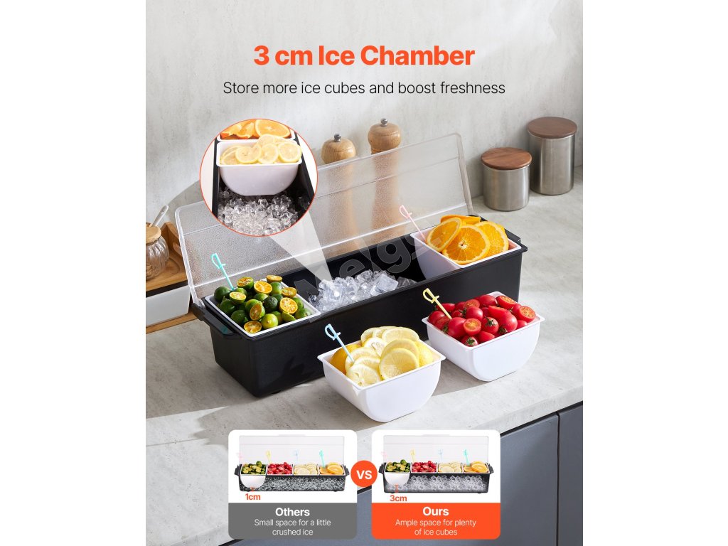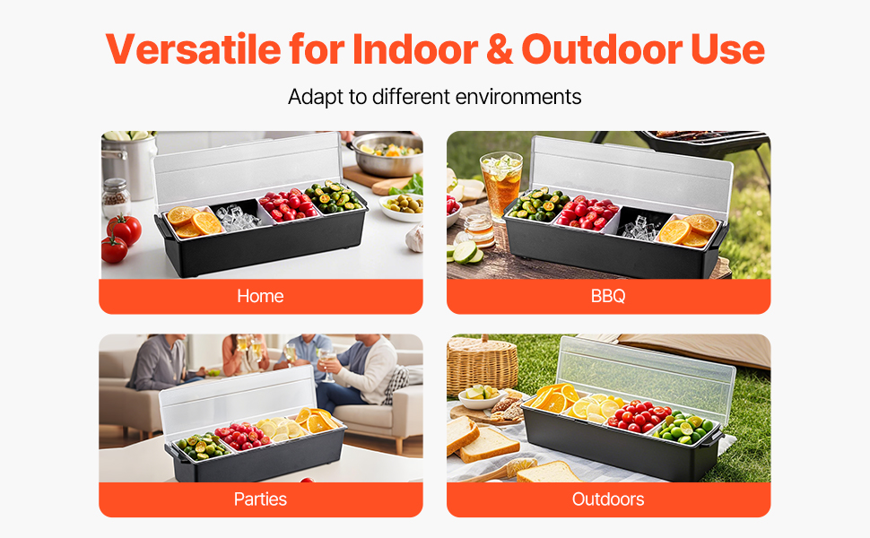 Náš ľadom chladený držiak na koreniny, ktorý je navrhnutý tak, aby sa bez problémov hodil do interiéru aj exteriéru, je ideálny na barmanské práce v bare, organizovanie rodinných stretnutí, organizovanie firemných podujatí alebo na vonkajšie aktivity, ako je kempovanie a grilovanie, a to všetko pri zachovaní čerstvosti a prezentácie potravín.