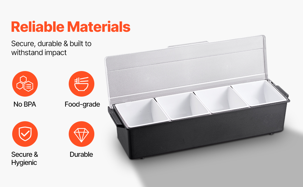 Naša nádoba na servírovanie korenín chladená ľadom, vyrobená z potravinárskeho plastu bez obsahu BPA, zaručuje bezpečné a hygienické používanie. Jej odolná konštrukcia ľahko zvládne každodenné nárazy a otrasy, vďaka čomu vydrží dlhšie.