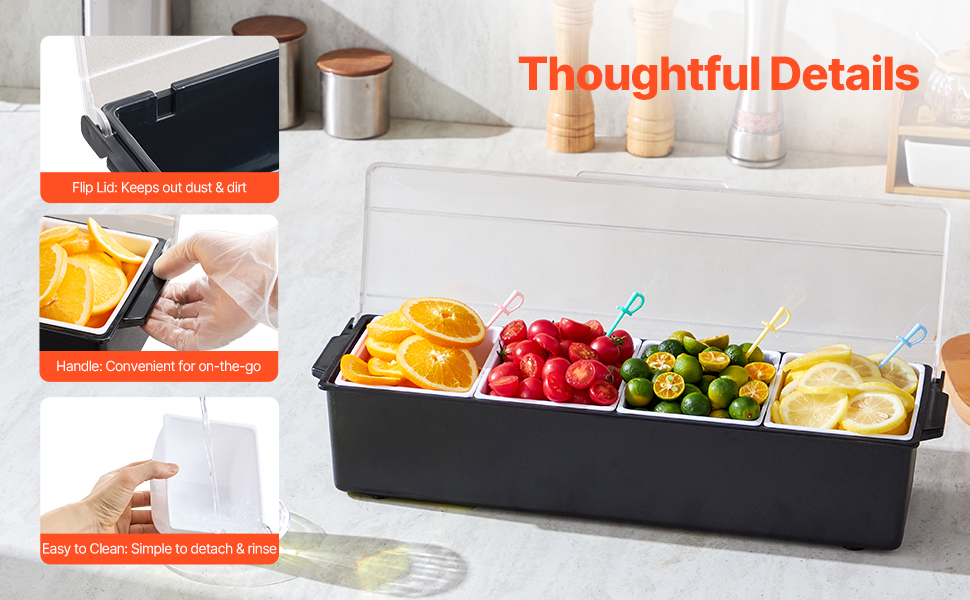 Náš barový zásobník na korenie s vekom je vybavený odklápacím vekom, ktoré zabraňuje prenikaniu prachu a nečistôt, a prenosnou rukoväťou na jednoduché prenášanie. Všetky súčasti sú odnímateľné na čistenie bez námahy, čo zaručuje, že zostane hygienická a čerstvá.