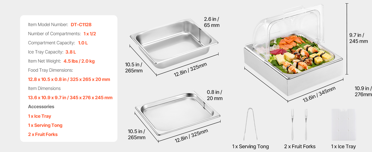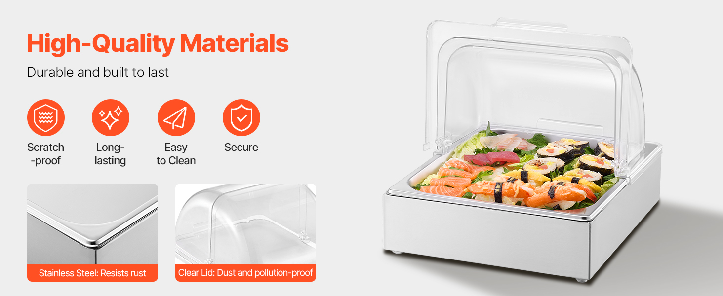 Zásobník na potraviny z nášho ľadom chladeného stojana na potraviny je vyrobený z potravinárskej nehrdzavejúcej ocele, má dlhú životnosť a ľahko sa čistí. Okrem toho je skonštruovaný tak, aby odolal nárazom, a je vybavený priehľadným vekom na jasnú viditeľnosť potravín, čím zabezpečuje bezpečné a atraktívne skladovanie.