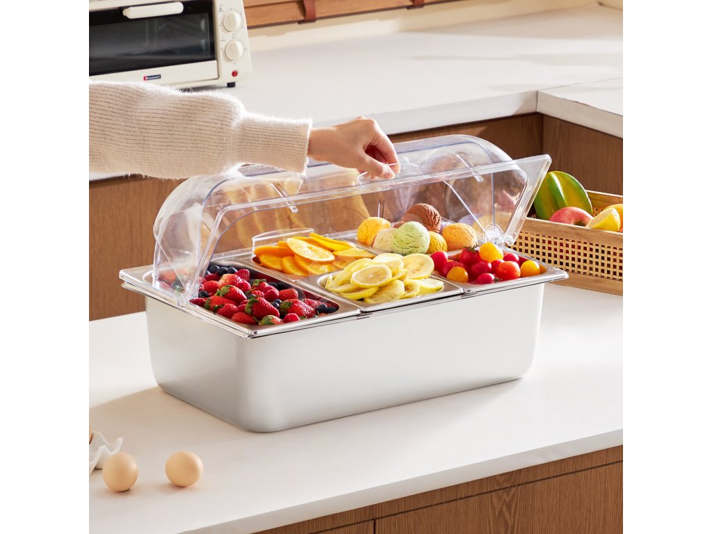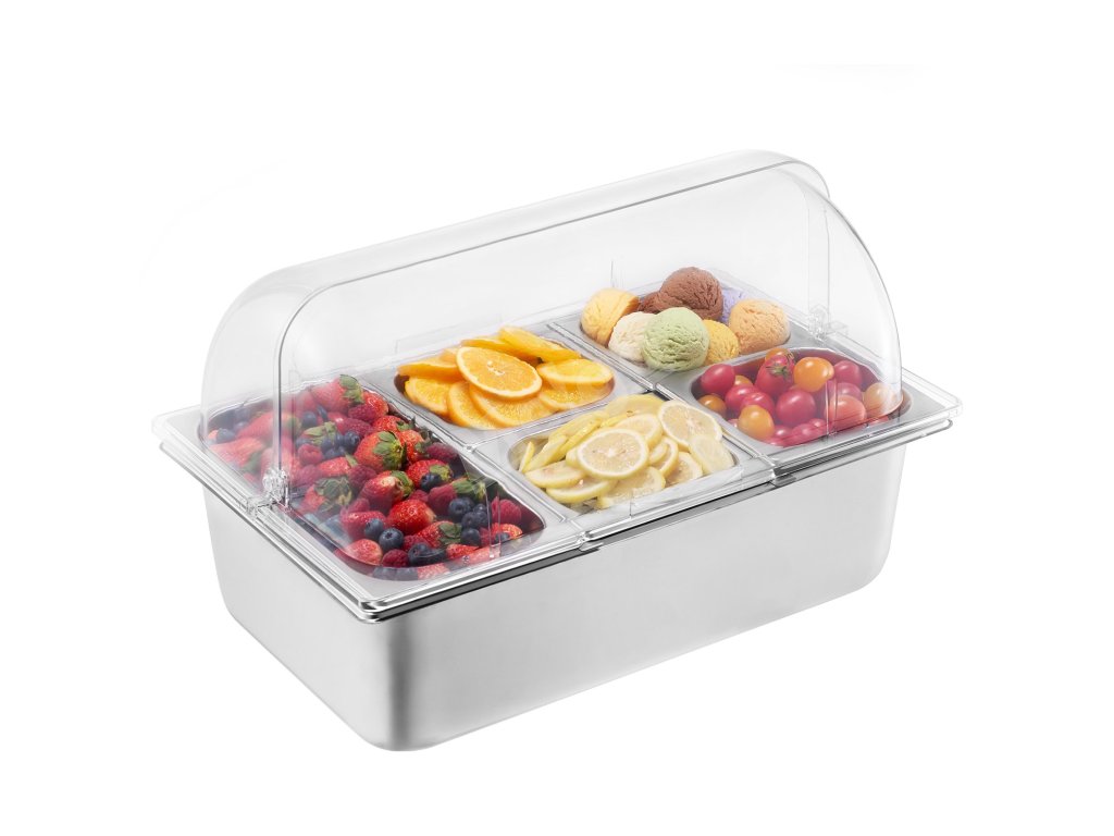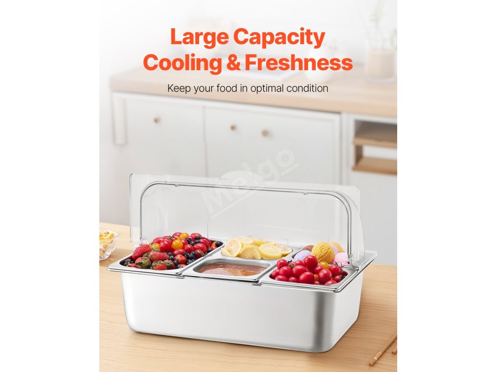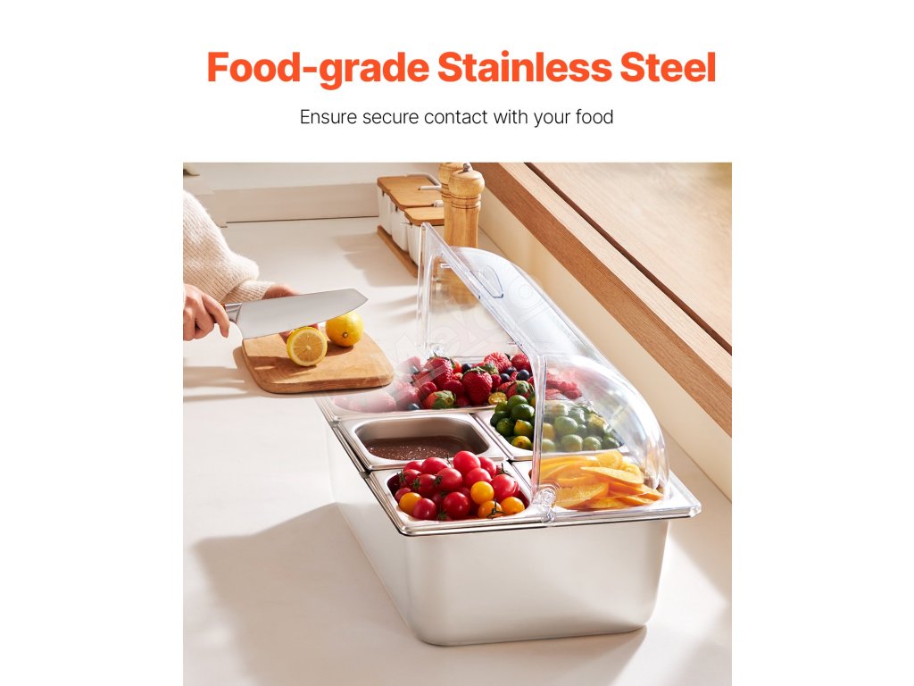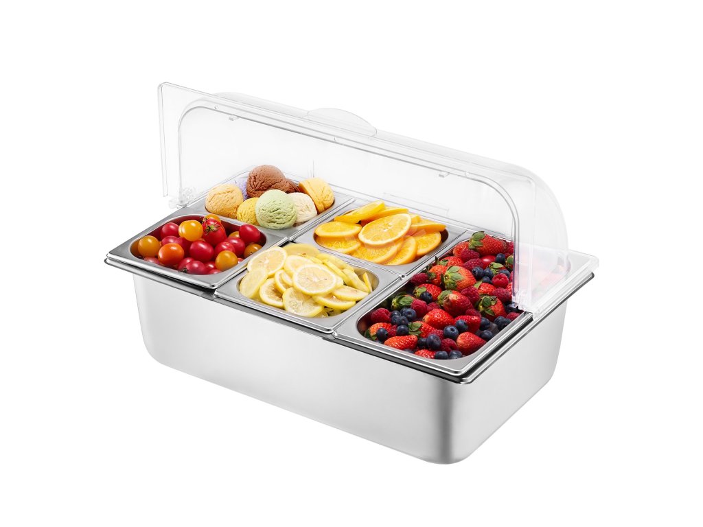 Zásobník na potraviny z nášho ľadom chladeného stojana na potraviny je vyrobený z potravinárskej nehrdzavejúcej ocele, má dlhú životnosť a ľahko sa čistí. Okrem toho je skonštruovaný tak, aby odolal nárazom, a je vybavený priehľadným vekom na jasnú viditeľnosť potravín, čím zabezpečuje bezpečné a atraktívne skladovanie.