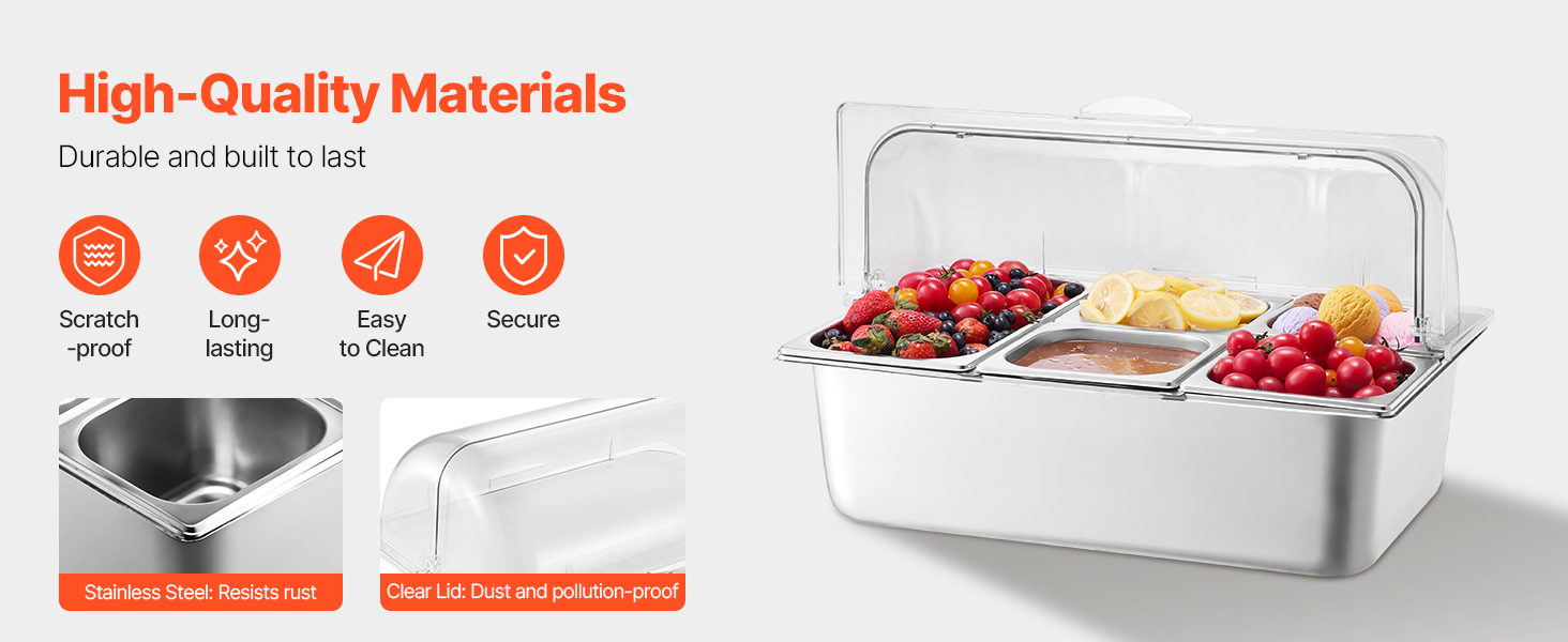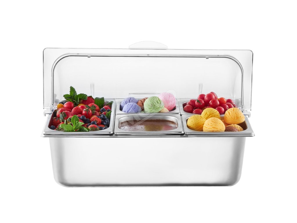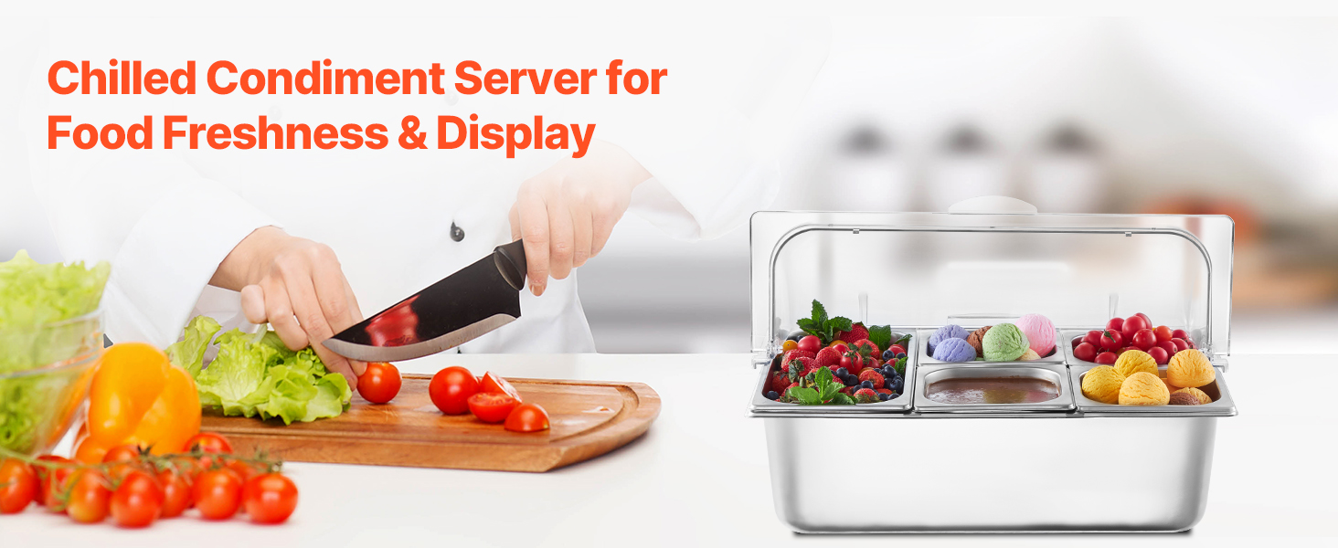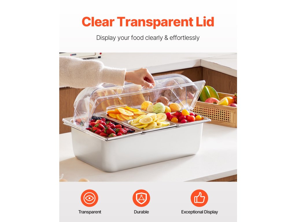 Zásobník na potraviny z nášho ľadom chladeného stojana na potraviny je vyrobený z potravinárskej nehrdzavejúcej ocele, má dlhú životnosť a ľahko sa čistí. Okrem toho je skonštruovaný tak, aby odolal nárazom, a je vybavený priehľadným vekom na jasnú viditeľnosť potravín, čím zabezpečuje bezpečné a atraktívne skladovanie.