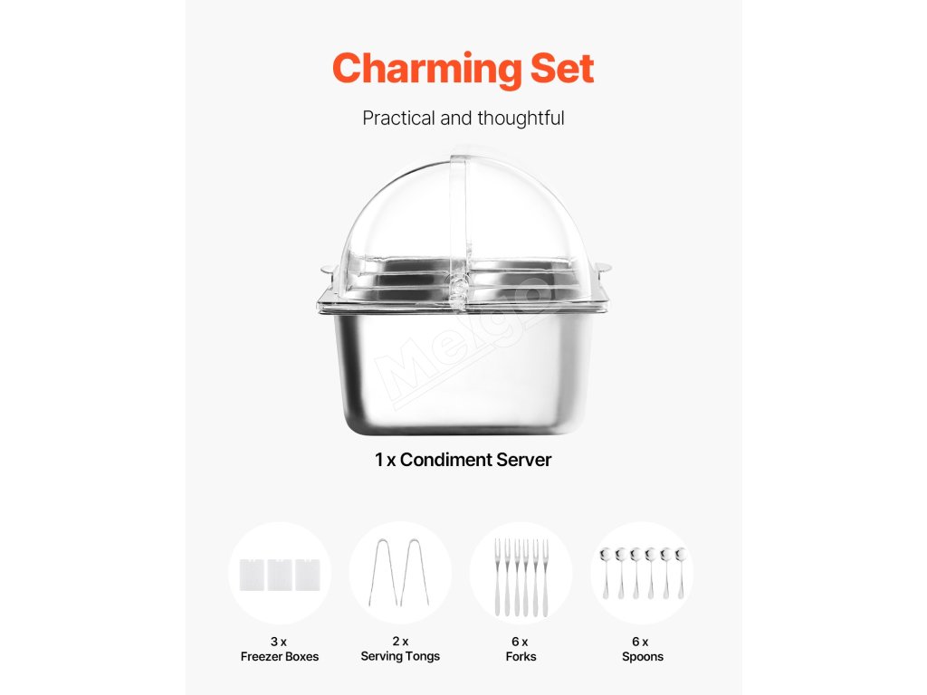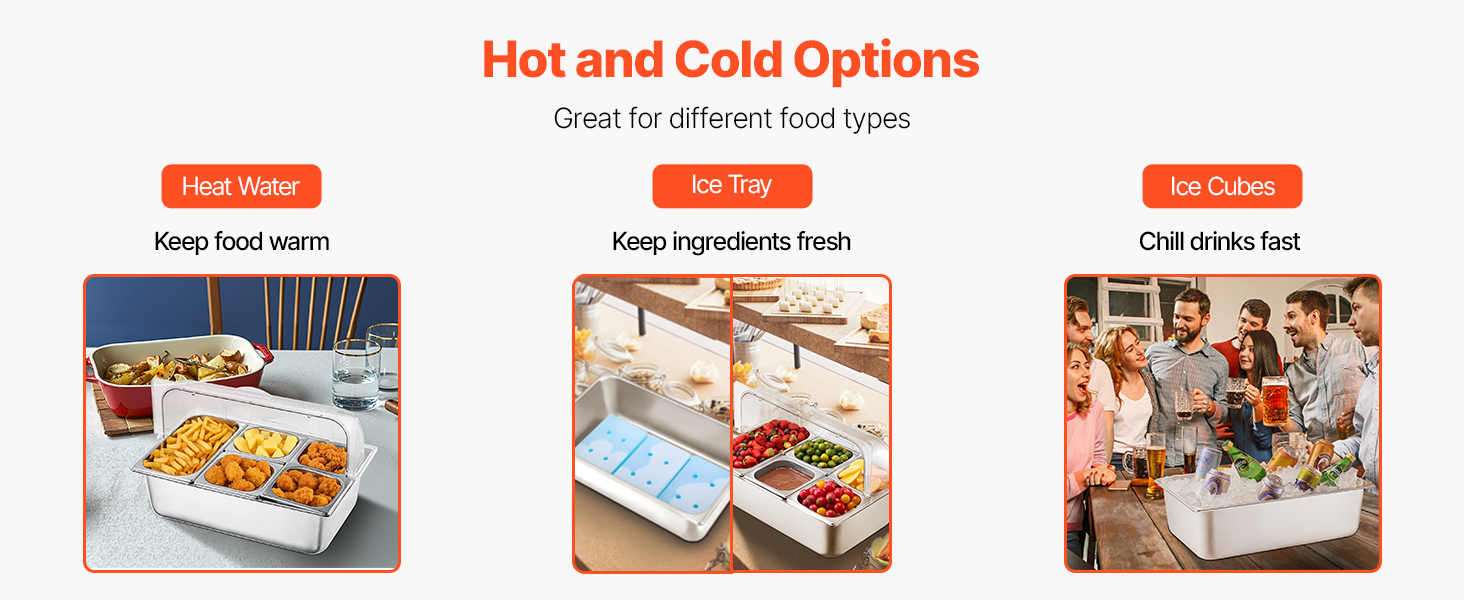 Naša nádoba na servírovanie potravín má jedinečný spodný priestor na uloženie horúcej vody, ľadových táckov alebo kociek ľadu, vďaka čomu si potraviny dlhšie zachovajú ideálnu teplotu. Či už ohrievate horúce pokrmy, alebo zabezpečujete, aby studené položky zostali čerstvé a chladné, prináša vynikajúce výsledky.