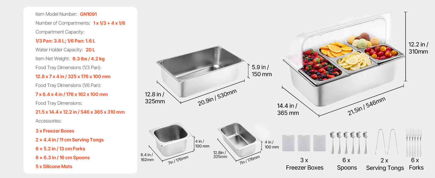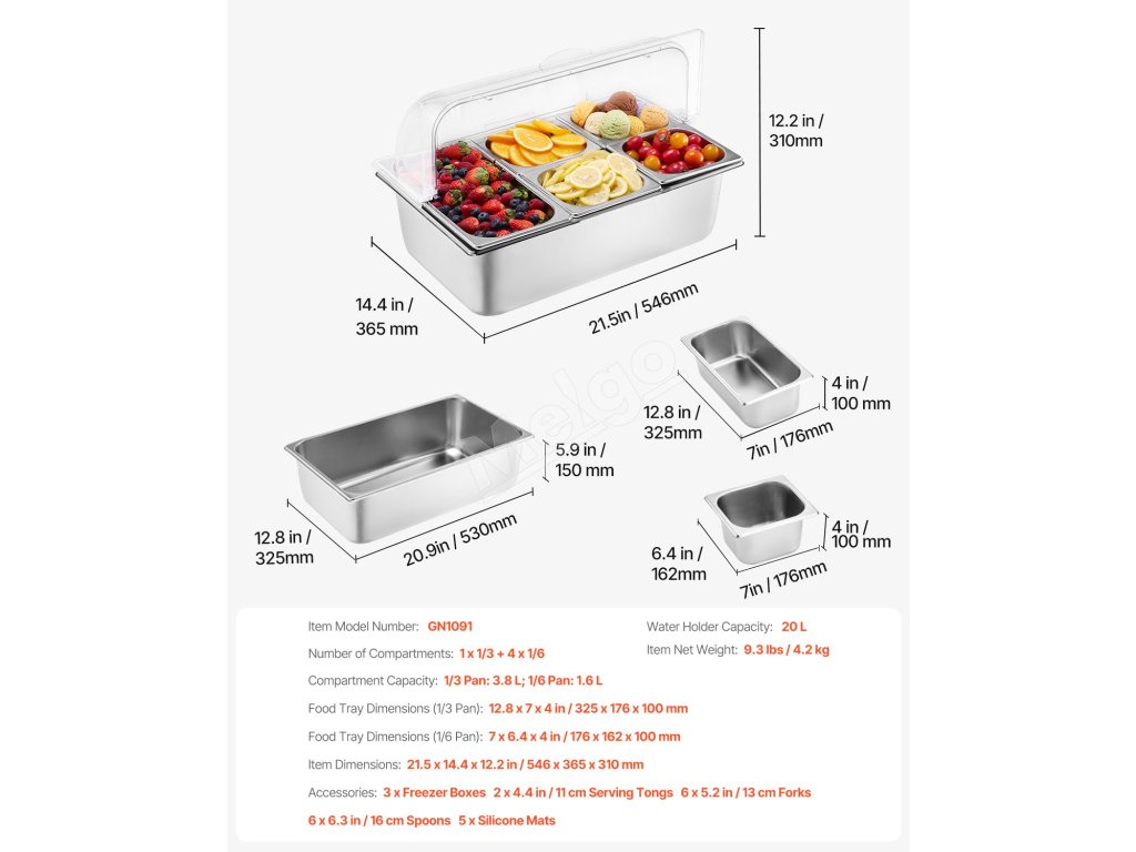 | Rozmery zásobníka na potraviny (1/3 panvice) | 12.8 x 7 x 4 palce / 325 x 176 x 100 mm |