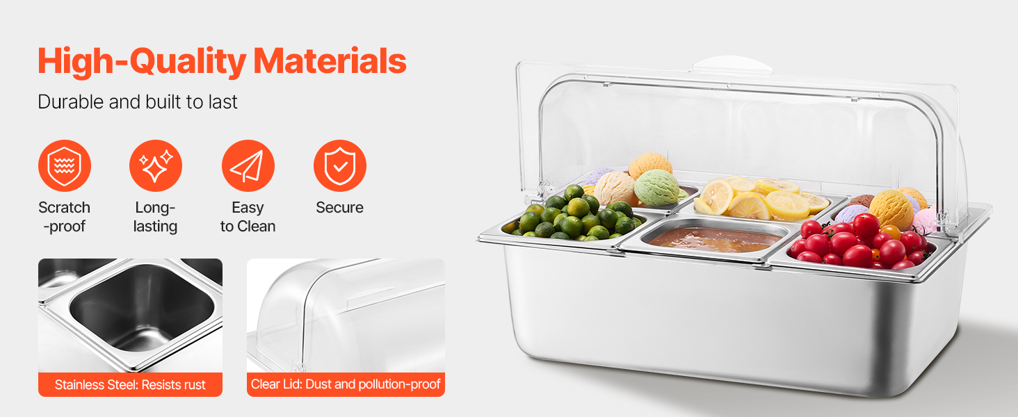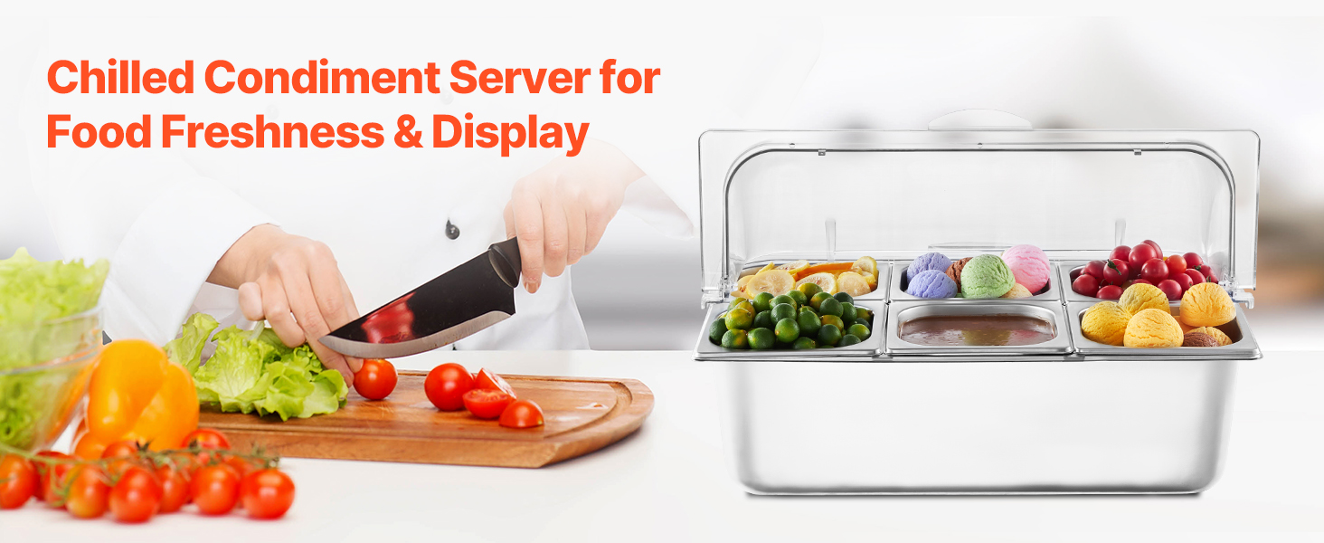 Zásobník na potraviny z nášho ľadom chladeného stojana na potraviny je vyrobený z potravinárskej nehrdzavejúcej ocele, má dlhú životnosť a ľahko sa čistí. Okrem toho je skonštruovaný tak, aby odolal nárazom, a je vybavený priehľadným vekom na jasnú viditeľnosť potravín, čím zabezpečuje bezpečné a atraktívne skladovanie.