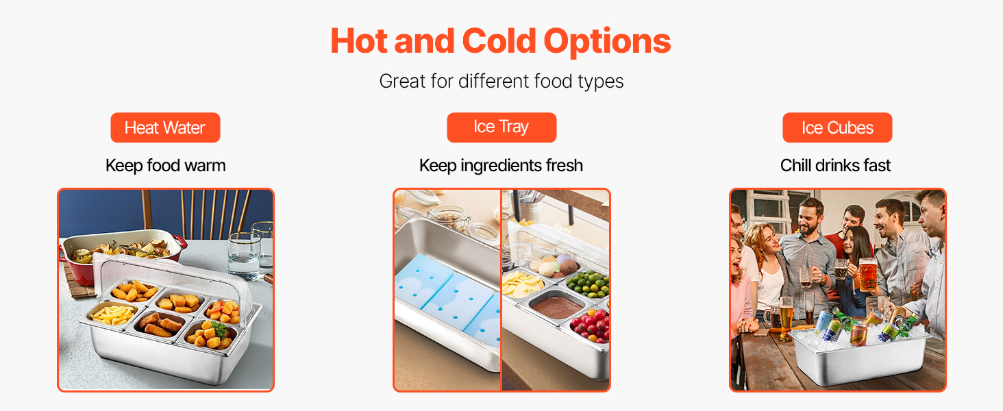 Naša nádoba na servírovanie potravín má jedinečný spodný priestor na uloženie horúcej vody, ľadových táckov alebo kociek ľadu, vďaka čomu si potraviny dlhšie zachovajú ideálnu teplotu. Či už ohrievate horúce pokrmy, alebo zabezpečujete, aby studené položky zostali čerstvé a chladné, prináša vynikajúce výsledky.