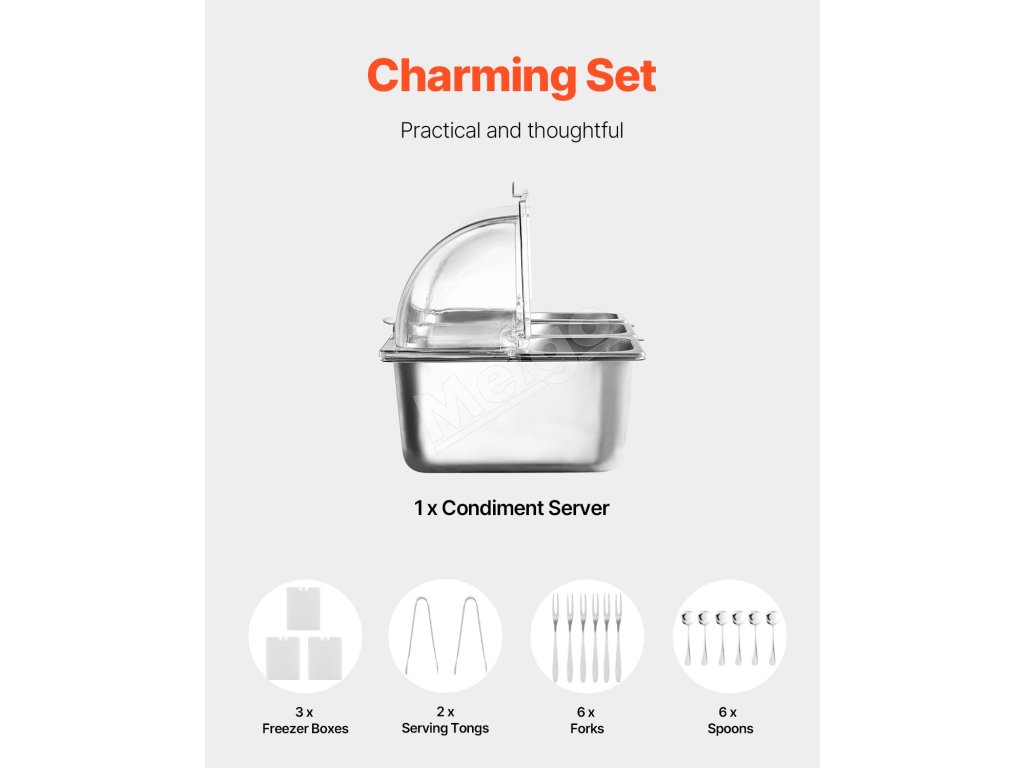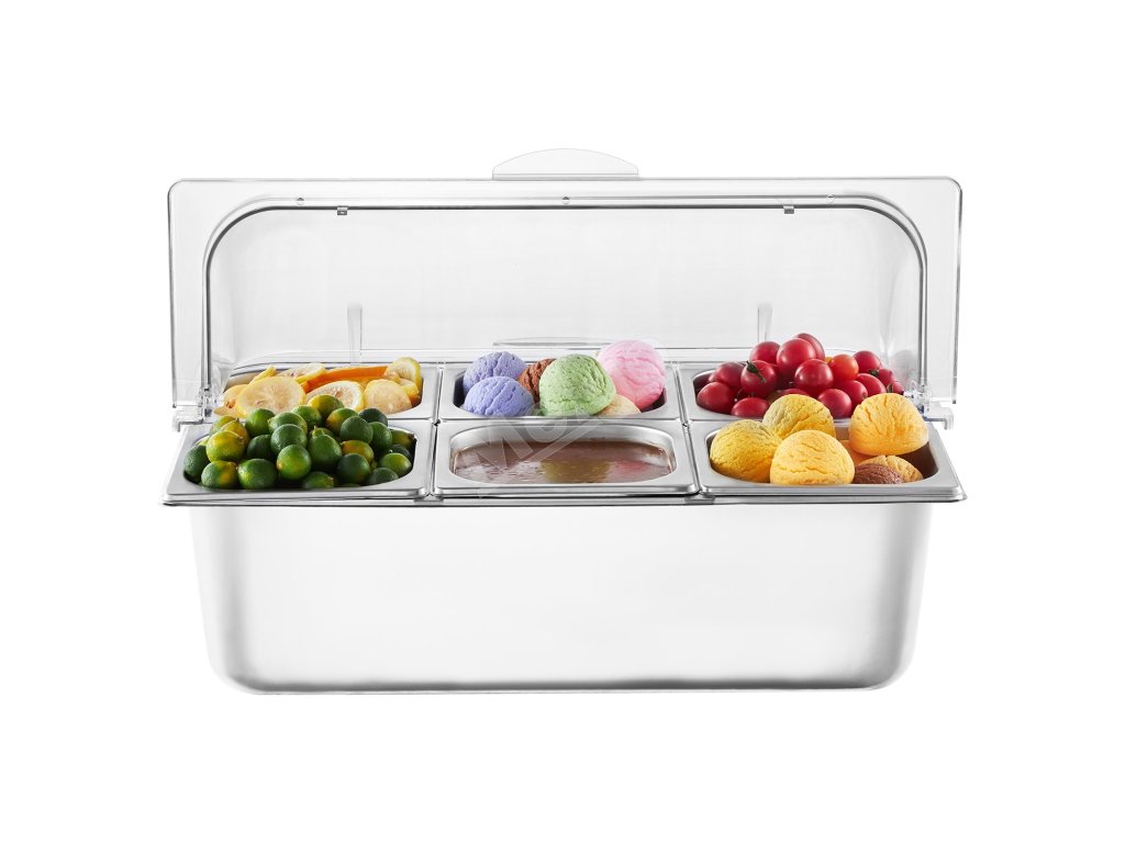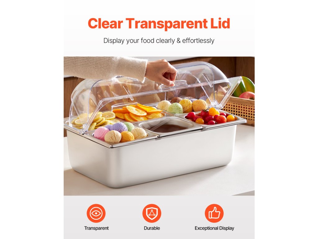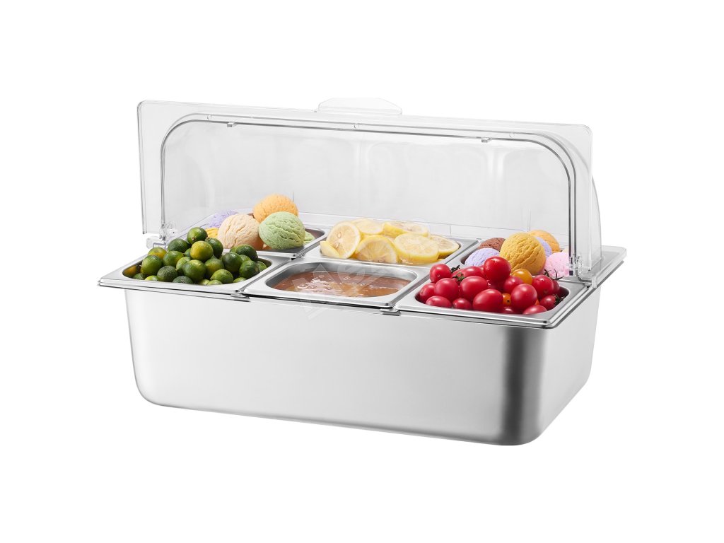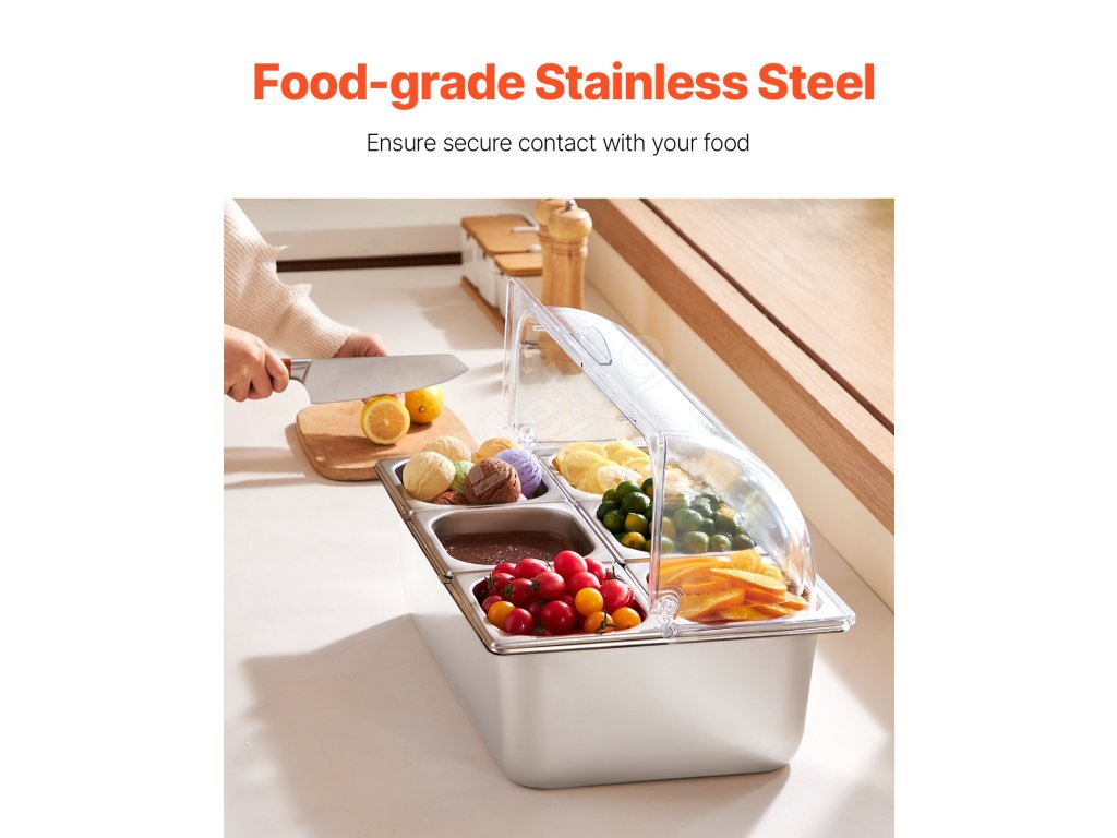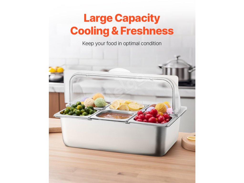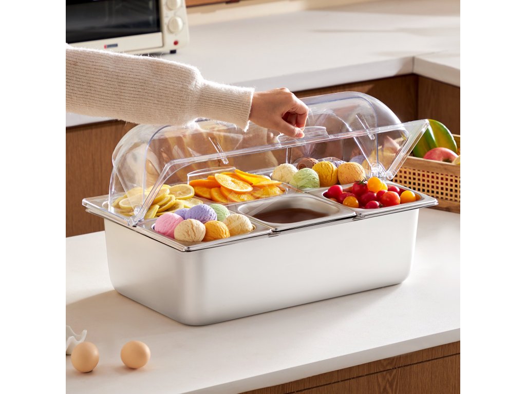 Zásobník na potraviny z nášho ľadom chladeného stojana na potraviny je vyrobený z potravinárskej nehrdzavejúcej ocele, má dlhú životnosť a ľahko sa čistí. Okrem toho je skonštruovaný tak, aby odolal nárazom, a je vybavený priehľadným vekom na jasnú viditeľnosť potravín, čím zabezpečuje bezpečné a atraktívne skladovanie.