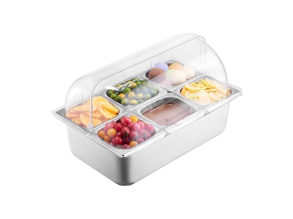 Stolový zásobník na jedlo, 6 nerez vaničiek, priehľadné viečko, 3 boxy