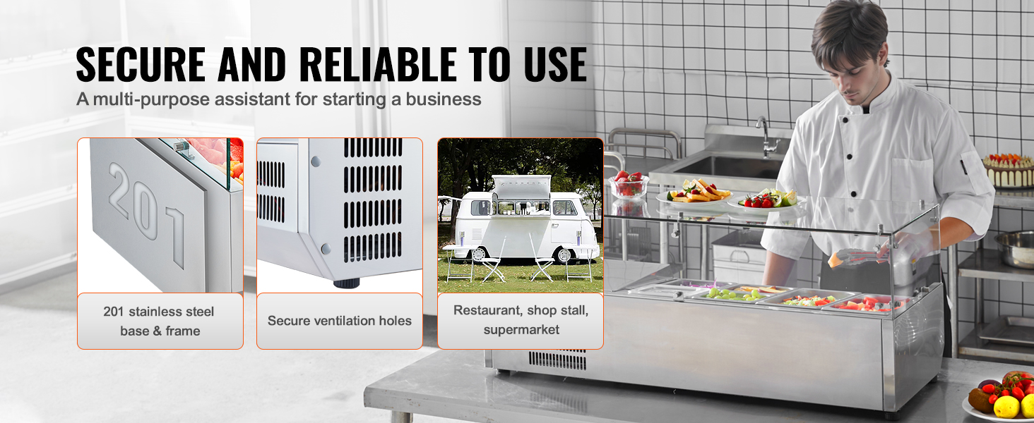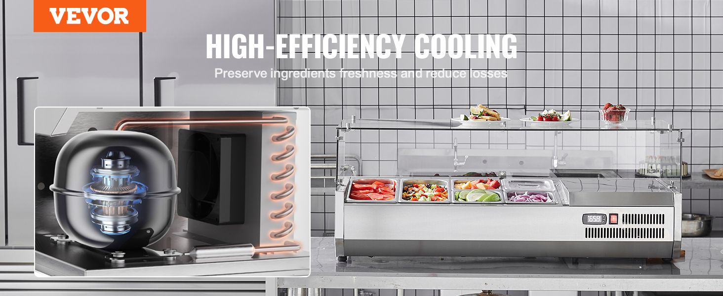 Trápia vás tieto problémy - ťažkosti s udržiavaním čerstvosti surovín, neúplné zobrazenie surovín a náročné čistenie a údržba? Pultová chladiaca stanica na prípravu korenín VEVOR, určená na komerčné použitie, optimalizuje rozloženie priestoru na skladovanie rôznych čerstvých prísad.