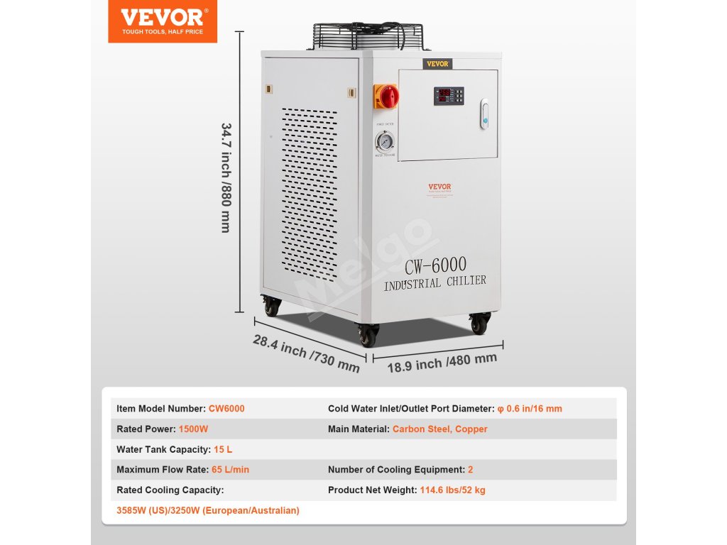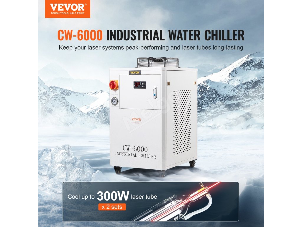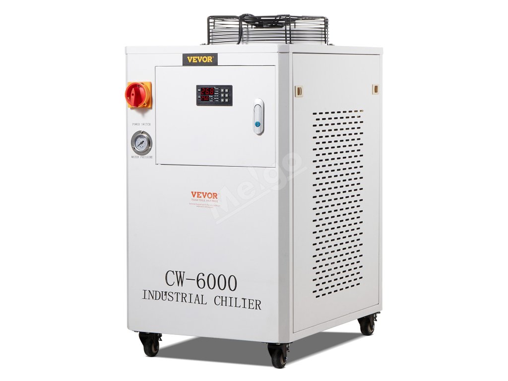Náš priemyselný chladič CW-6000 je vybavený zabudovaným kompresorom pre stroje vyžadujúce kompaktné riešenia chladenia vodou. S 15-litrovou nádržou na vodu a zabudovaným chladiacim ventilátorom na vynikajúcu ventiláciu je ideálny pre 2 sady laserových gravírovacích strojov CO₂ s laserovými trubicami s výkonom do 300 W.
