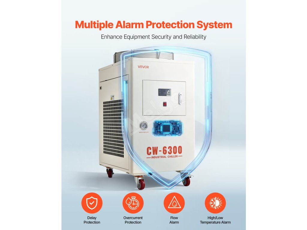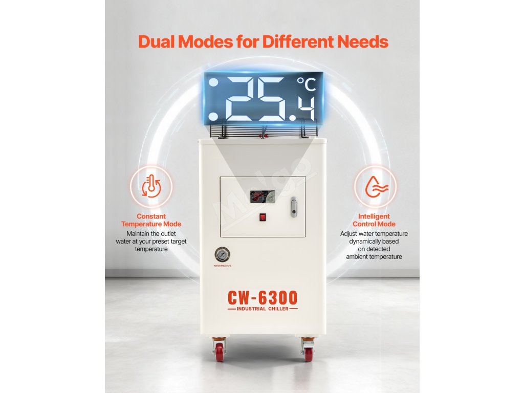 Navrhnutý s výkonným kompresorom a vodným čerpadlom na rýchle odvádzanie tepla a udržanie stabilnej prevádzky laserových gravírovacích strojov a CNC strojov. Vďaka režimu konštantnej teploty, inteligentnému režimu ovládania a viacerým alarmovým ochranným funkciám je ideálny na chladenie jednej 600 W alebo dvoch 300 W laserových trubíc.